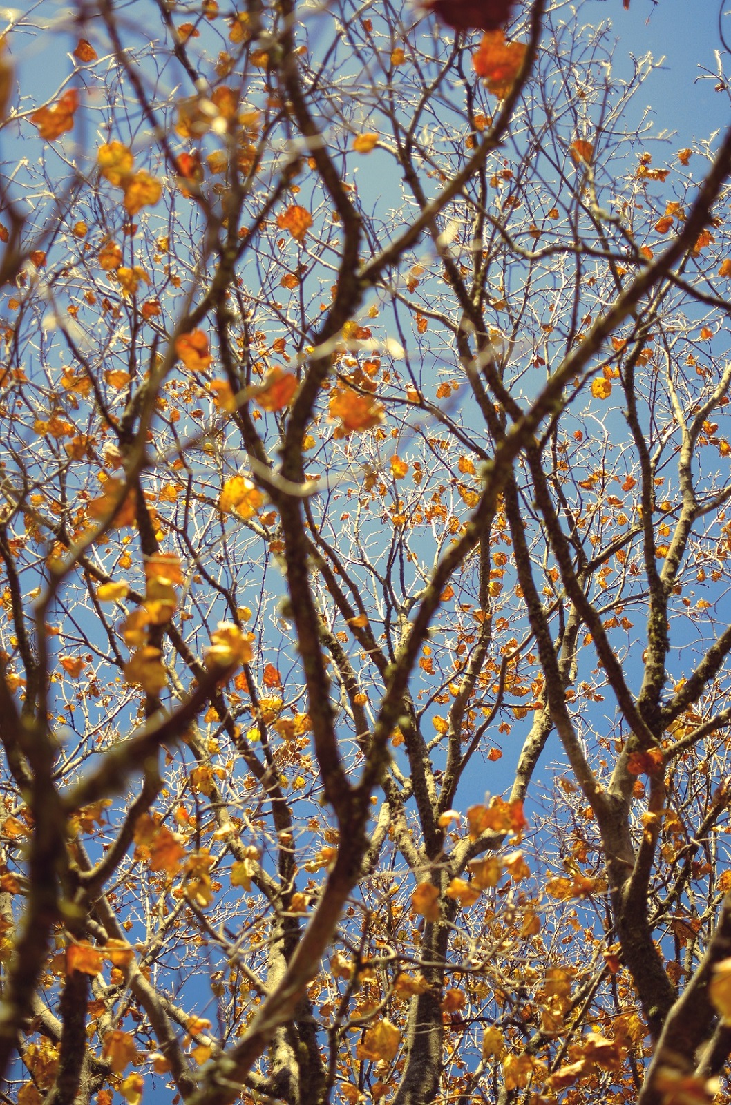 Bello questo intricatissimo disegno autunnale..Peccato i rami in primo piano fuori fuoco che un po' sporcano ...la complementarietà tra azzurro e oro è davvero piacevole
