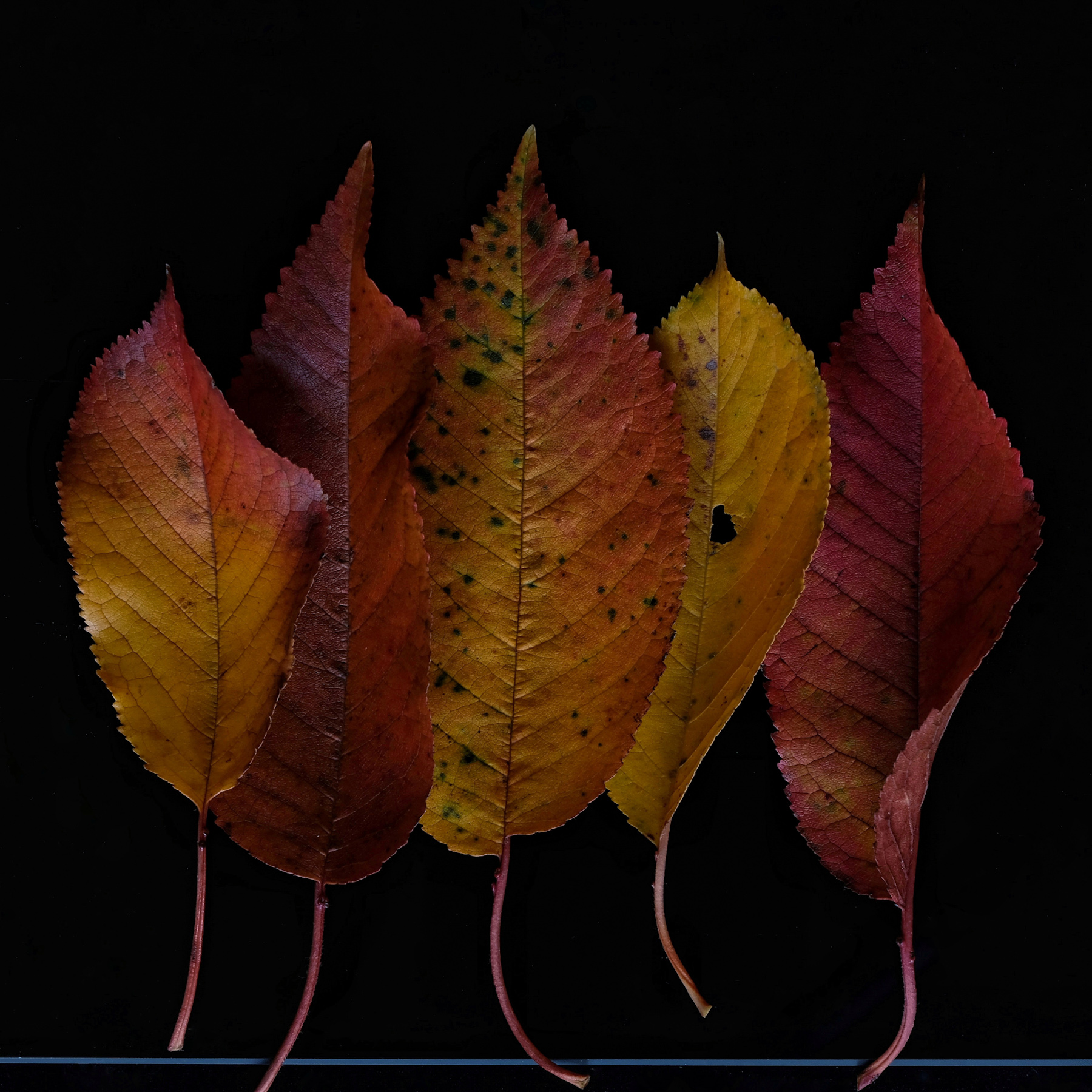 Molto gradevole questa fila di foglie vestite dei colori dell'autunno anche se non capisco perché tu abbia inserito in basso quella riga blu