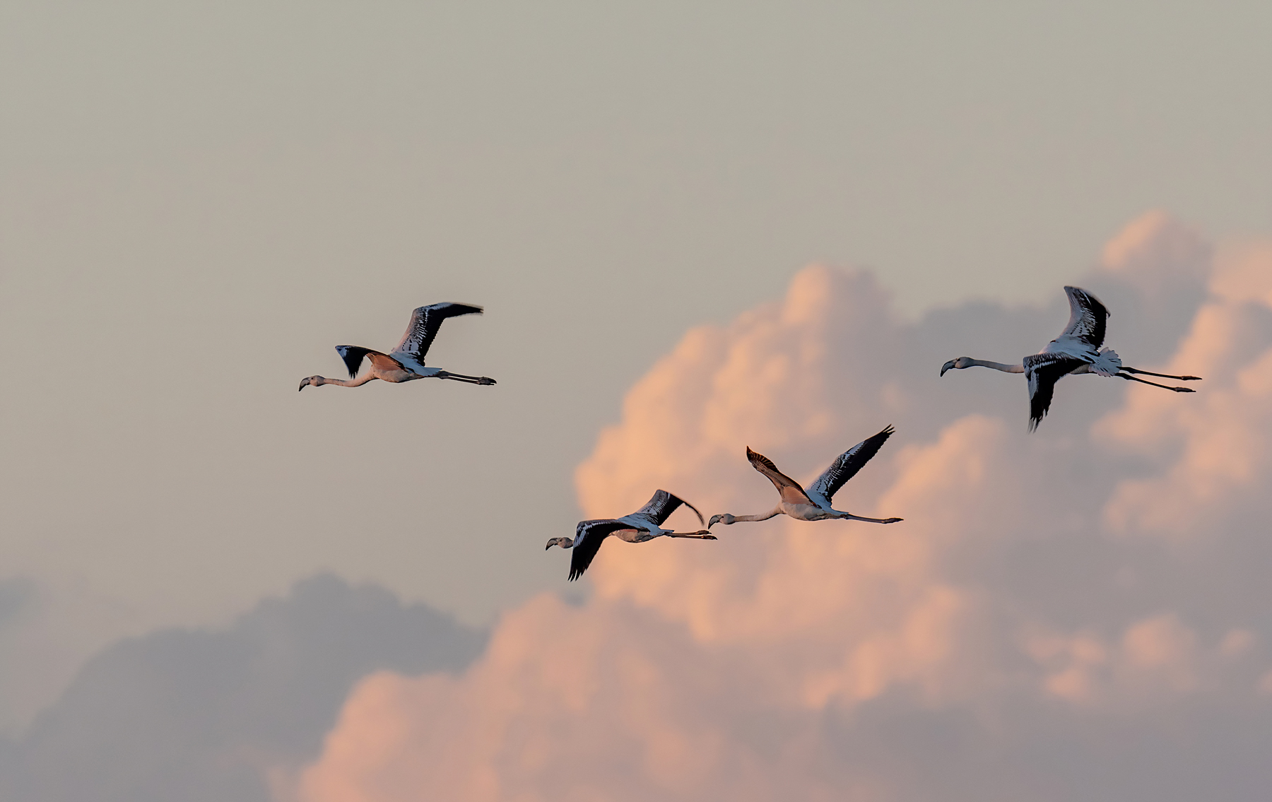 Bello questo volo di Fenicotteri, piacevole lo sfondo e la luce.