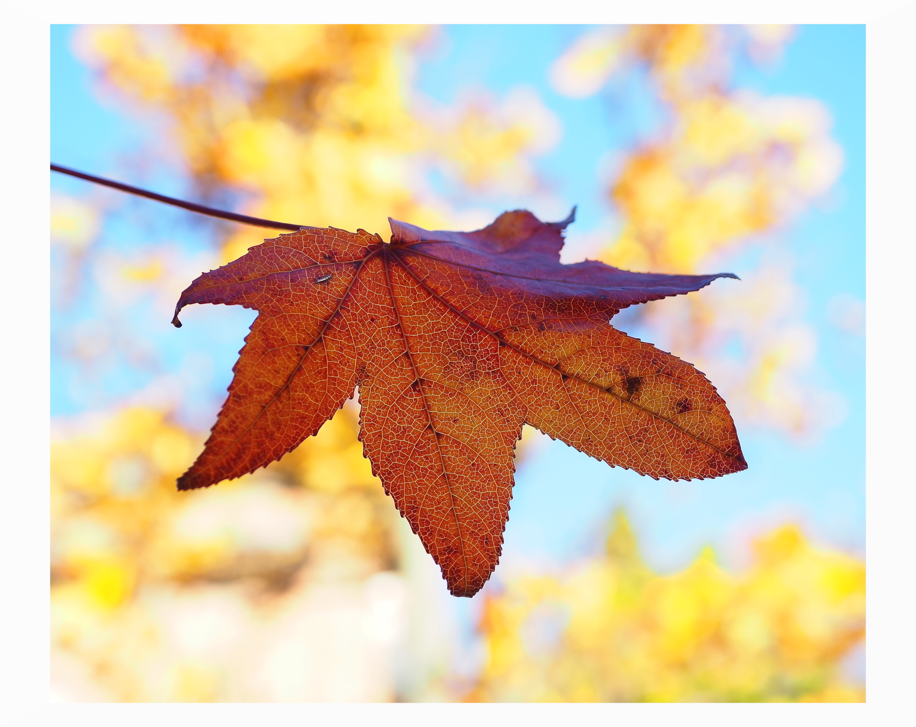 E’ il periodo di questo genere di immagini. Ogni anno non si scappa; arriva l’autunno, con i suoi colori e giustamente il suo fascino si fa sentire a livello di immagini fotografiche. Viali alberati multicolori, chiome tinte con i colori autunnali e macro o scatti che immortalano singole foglie o fronde. Niente di nuovo allora qui’….forse si, come tipologia di soggetto, ma il risultato è veramente bello e non comune. Non passa inosservato e non si dimentica fra i mille altri che si vedono in giro. Prima di tutto ci vedo una disposizione della foglia veramente efficace e curata. La sua superficie piega verso l’osservatore mostrando la trama superficiale; poi gradualmente si propaga con una leggera e bella sfocatura verso il là. Lo sfondo è veramente ben fatto. Sfocato, con un ottima gradazione, che lascia il soggetto “solo” e unico elemento presente e tangibile e gli conferisce una grande presenza e la sensazione che “esca dal piano”. E poi i colori dell’immagine sono veramente notevoli; una combinazione cromatica ineccepibile. Sfondo giallo ed azzurro, due tinte che insieme danno una combinazione efficace. Soggetto verso il marrone. Tinta che, con il contributo dell’effetto fuoco/sfocato, spicca in modo efficace. Soggetto non nuovo ma resa perfetta. Ottimo.