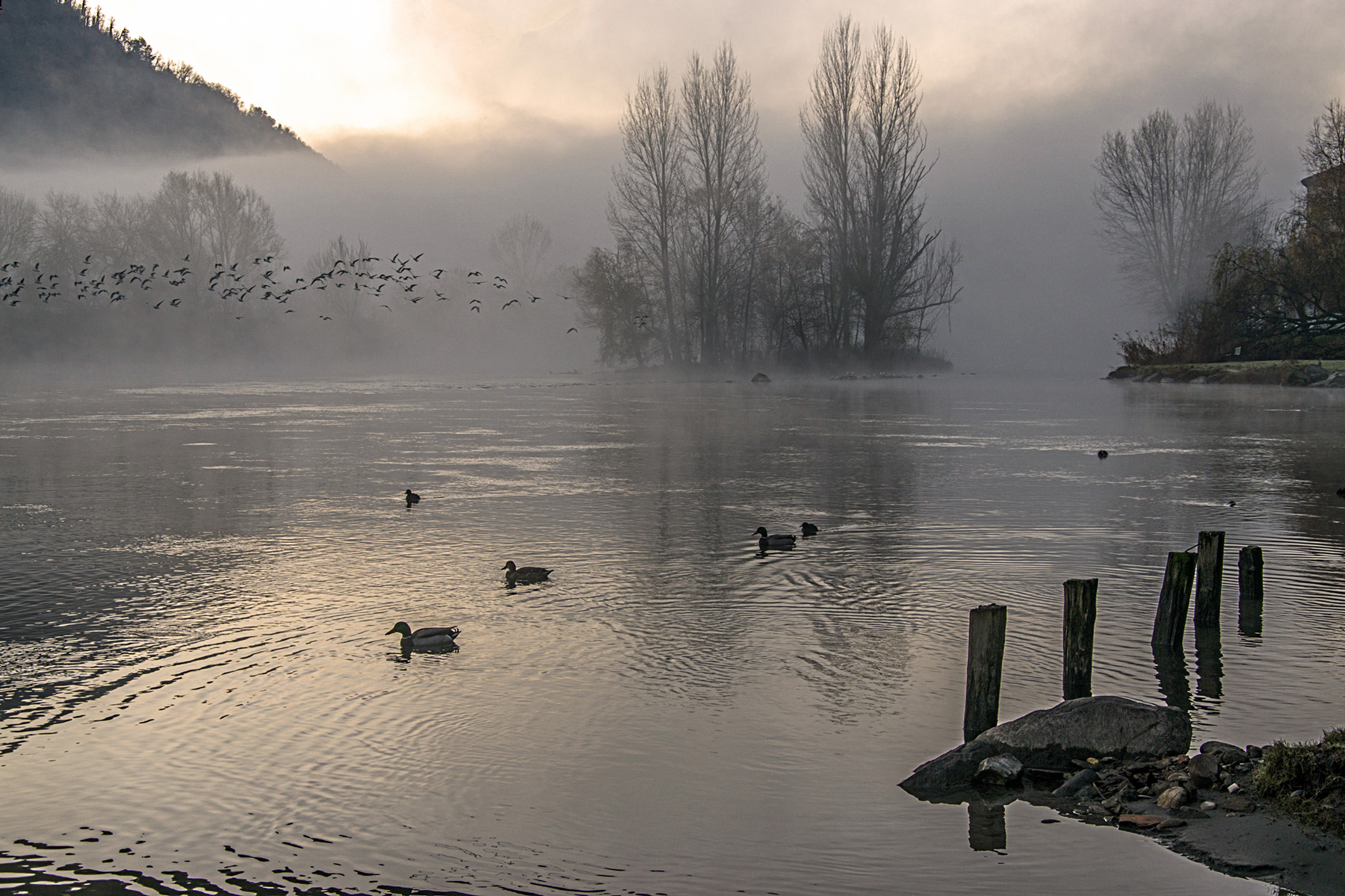Una bella scena. Molto ricca e densa di elementi ma, per me, la tiene in piedi benissimo la sua costruzione e composizione. Si pio' dire questo esaminando le linee e diagonali che si formano fra gruppi di elementi.Le papere in acqua formano una direttrice che segue la linea del corso d'acqua a destra. Gli uccelli in volo disegnano una linea retta che risulta parallela all'orizzonte delle acque. Paletti verticali in primo piano a dx che "mimano" le piante sullo sfondo in mezzo....Sembrano valutazioni da maniaco e sicuramente quando uno scatta non sta a farle. Semplicemente una volta vista la foto servono a capire e spiegarsi perché essa appare bella e piacevole. ci sono sempre ragioni per le quali un qualcosa é bello da vedere. Trovare questi dettagli puo' poi aiutare a muoversi meglio.