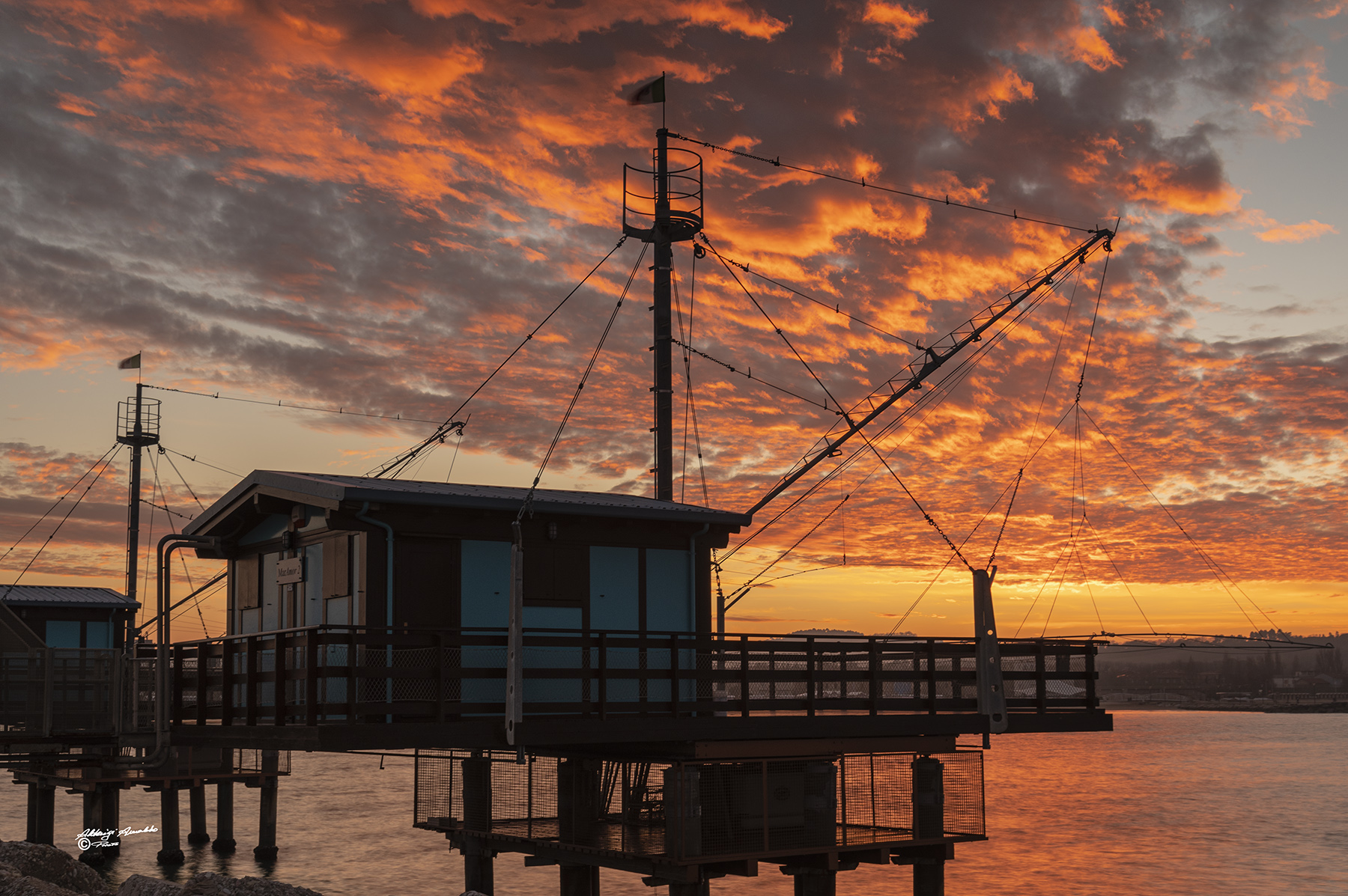 Che bel cielo infuocato hai trovato. Giusto aver fatto il possibile perché lui restasse il protagonista, e anche il trabucco,con i suoi cavi geometricamente danzanti ,fa da elegante comparsa ma senza sminuire ne esser sminuito. Hai restituito un bel equilibrio. Ciao