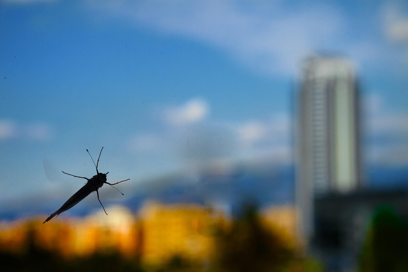 Fortuna che sta fuori… un brutto insetto nero contrapposto alla colorata luminosità del panorama esterno, in una bella giornata assolata…