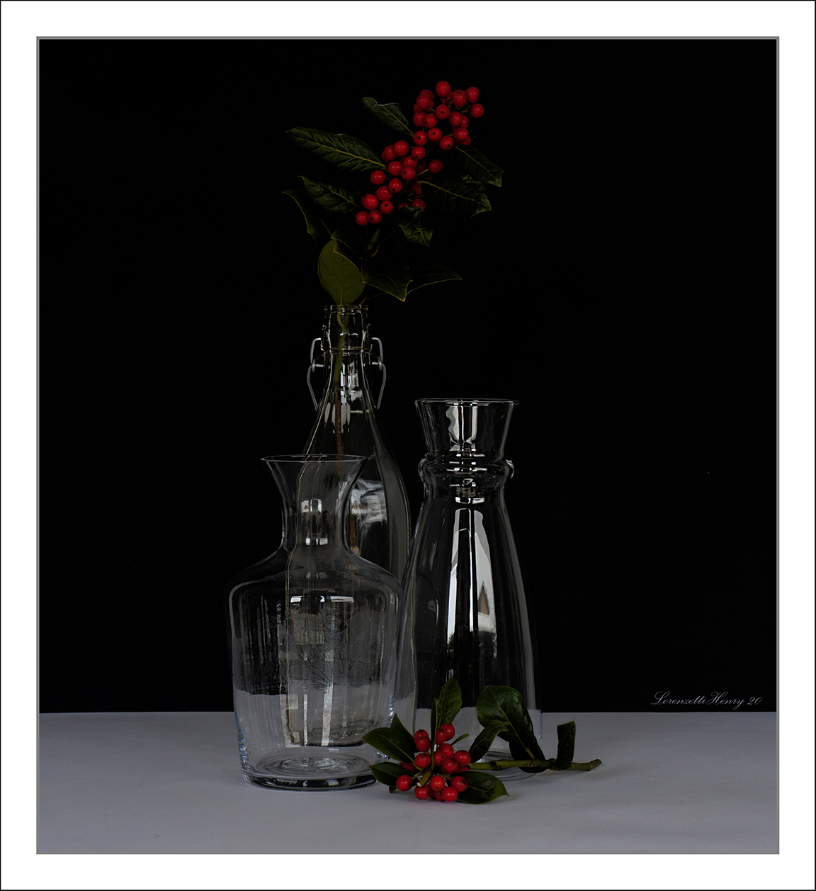 Ti sei cimentato con un soggetto davvero difficile! Mi piace la disposizione degli oggetti con la sovrapposizione dei vetri. Le note di colore delle bacche rosse sono giustissime ma avevano bisogno di un pizzico di luce in più. L'illuminazione frontale di solito sarebbe da evitare in quanto appiattisce la scena facendo perdere tridimensionalità agli oggetti che risultano omogeneamente illuminati e senza ombre!