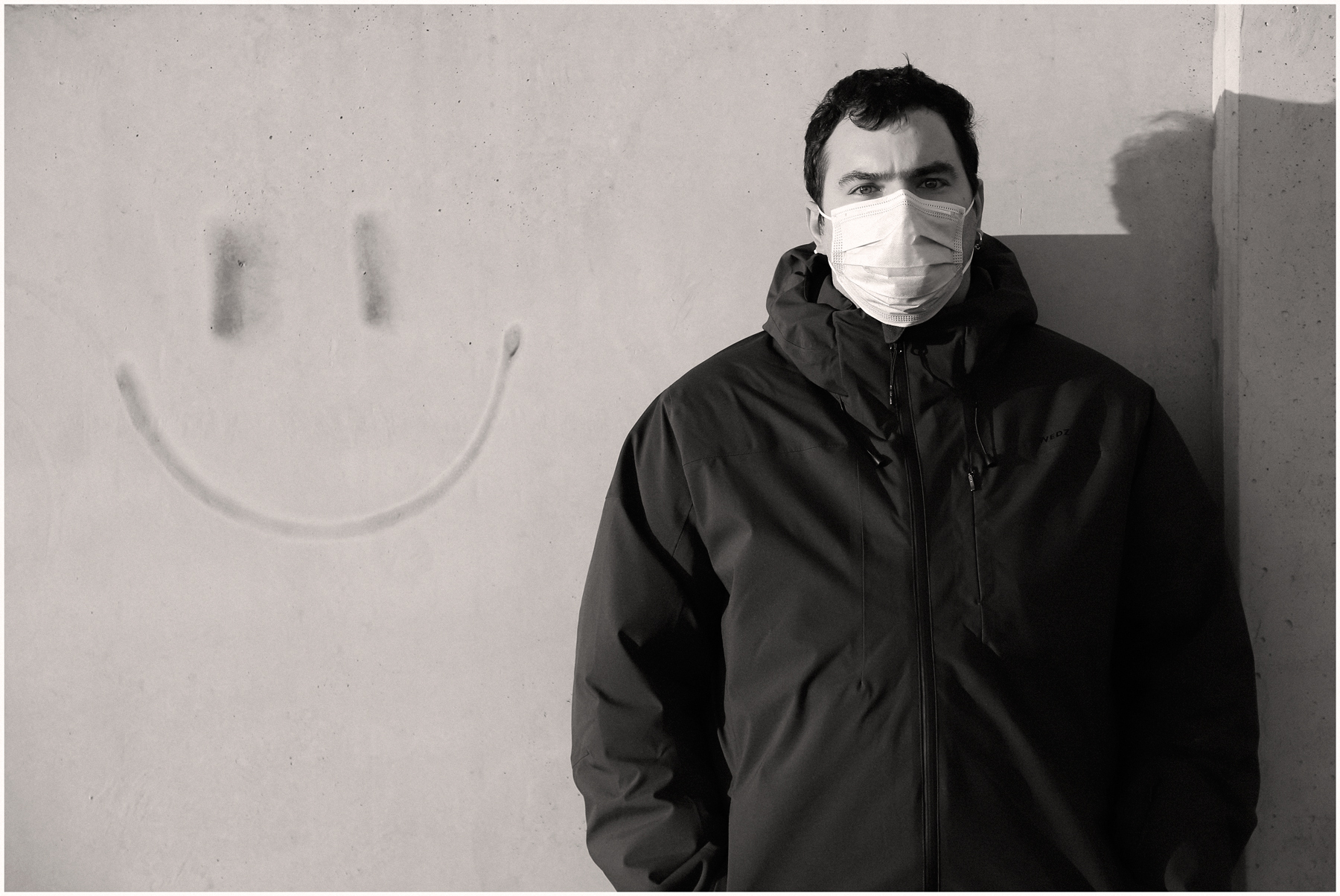 Smail che inizia a riaffiorare dal muro con la persona che fa “linguaccia” sotto la mascherina ( così mi sembra dalla forma assunta dalla mascherina). Un augurio per l' uscita dalla pandemia