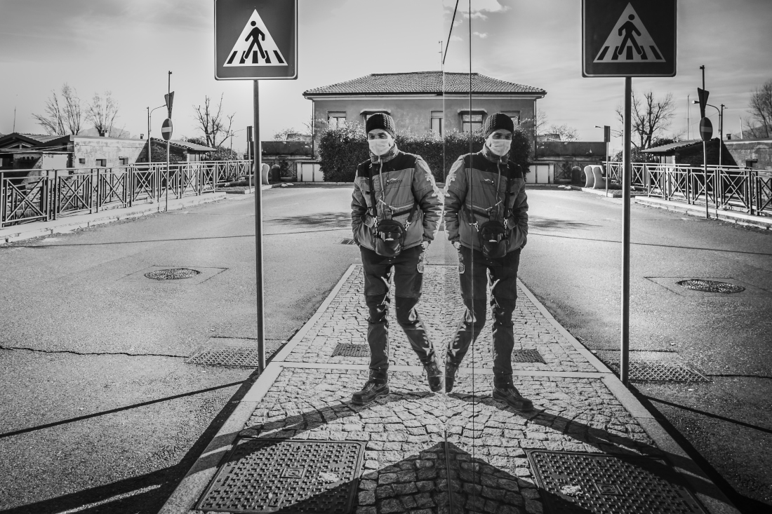 L'attenzione al doppio generato dal riflesso, non va solo al soggetto e al paesaggio, ma anche alle ombre, tra cui quella dell'uomo che funge da chiusura sugli angoli bassi.
