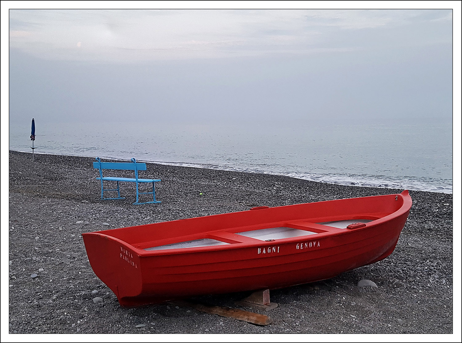 Tutti e tre - barca, panchina e ombrellone - hanno svolto il loro lavoro estivo senza risparmiarsi. Adesso si godono il meritato riposo e il piacere di un mare tranquillo. In attesa della prossima estate.