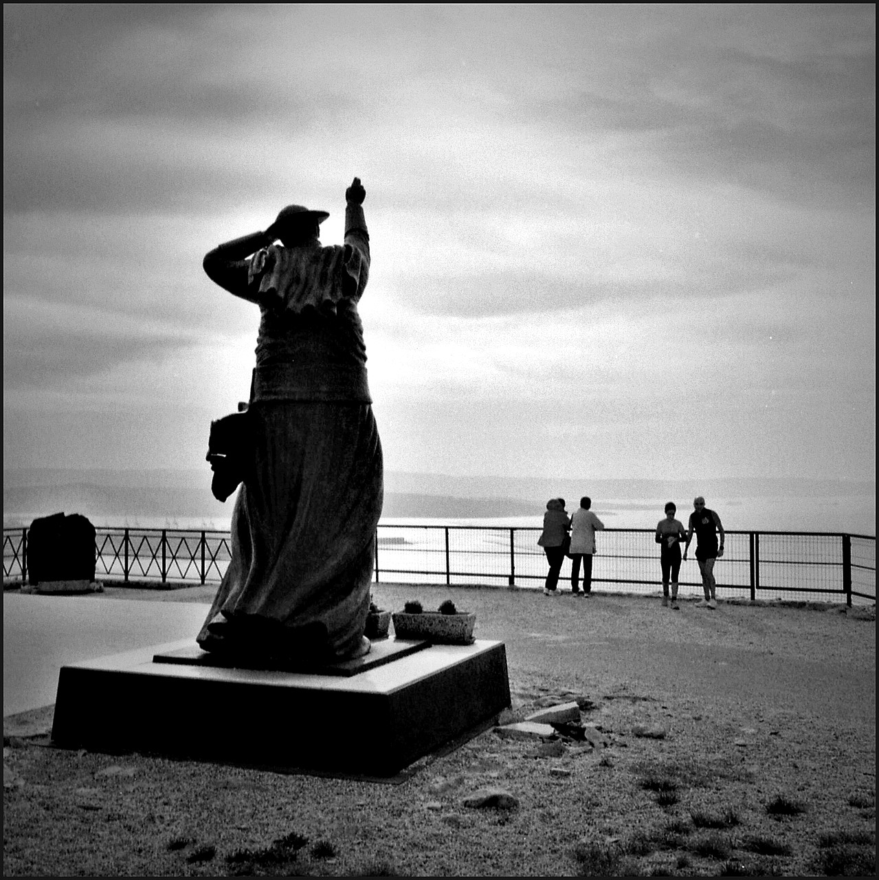 Bella immagine, in cui il vescovo sembra indicare la rotta, il cammino… Molto ben gestito il controluce attraverso la statua, che comunque resta leggibilissima, e appropriati il formato e il bn.