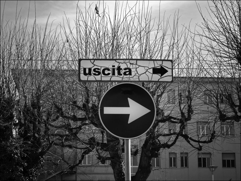 Trovo ottima la trama del cartello uscita ripetuta dai rami spogli degli alberi dietro, un ottimo colpo d'occhio