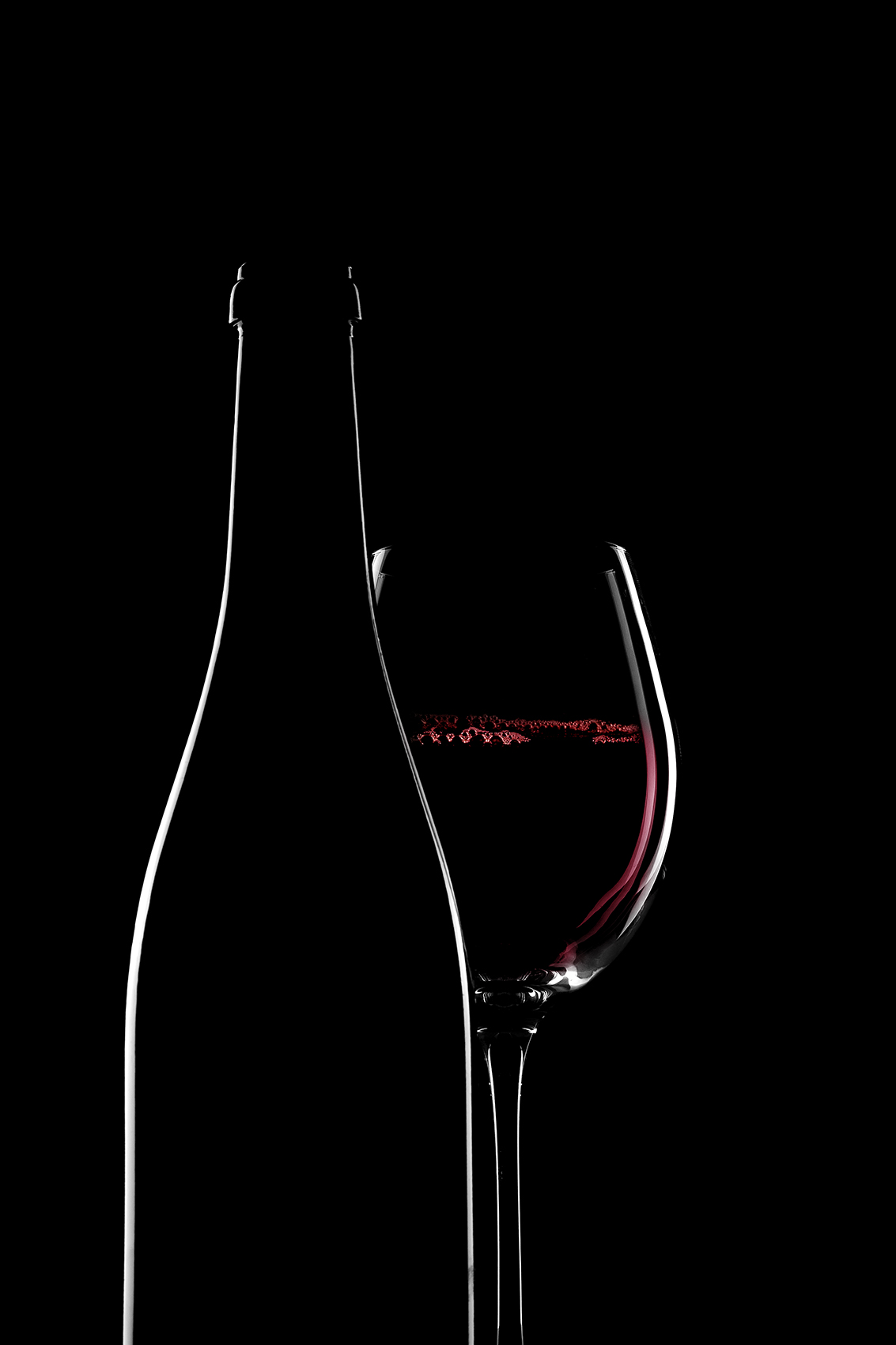 | Molto ben realizzata la silouette luminosa dei vetri, cosa non semplice,  eccellente il vino ed il riflesso sul bicchiere.  Forse il punto debole sta nella parti inferiore della foto (non croppata) dove il fondo della bottiglia sparisce nel buio! |  |