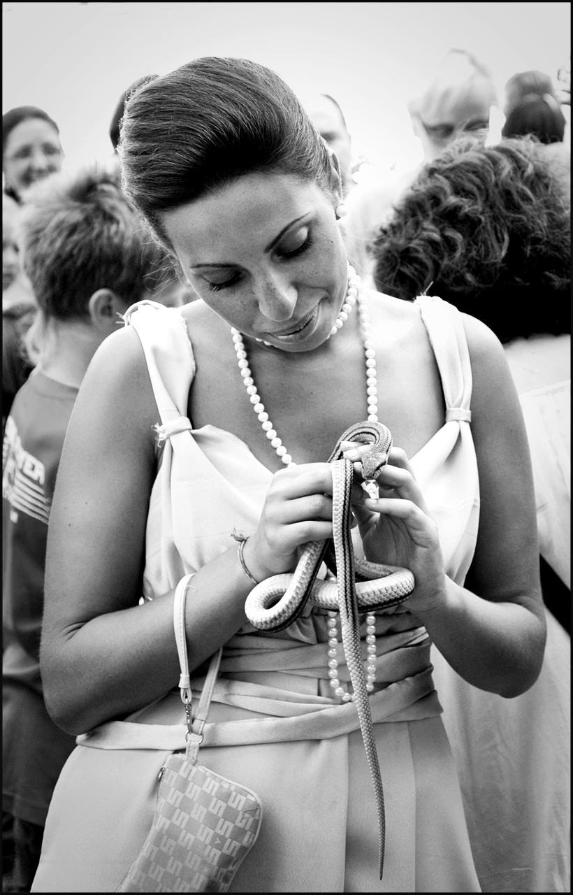 Fantastica questo scatto con la signora che tiene il serpentello tra le mani e sotto tutto aggrovigliolato.. fa un pò senso.. Un ottima imagine.