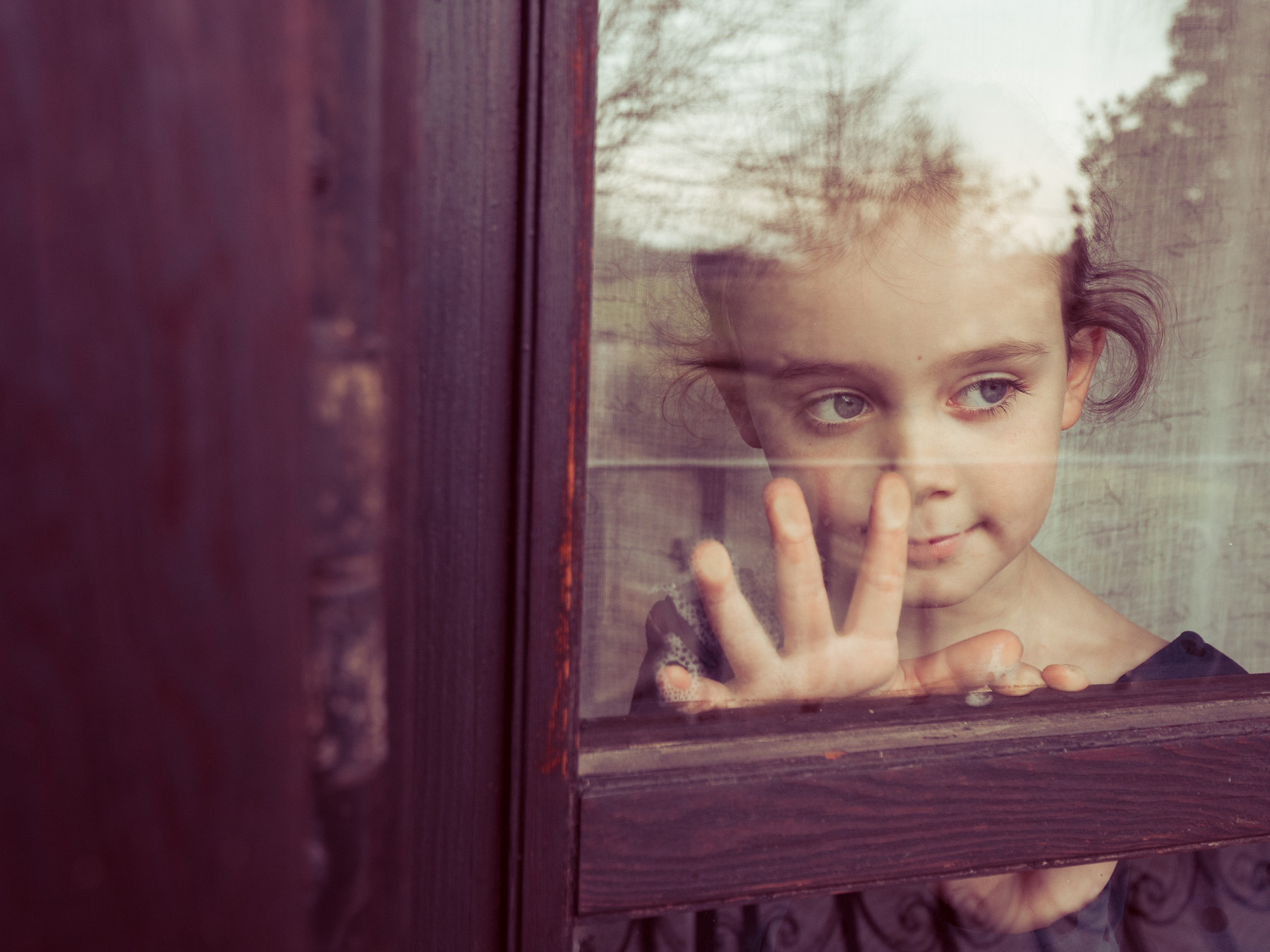 La bimba sembra guardar fuori e immaginare storie di fantasia.