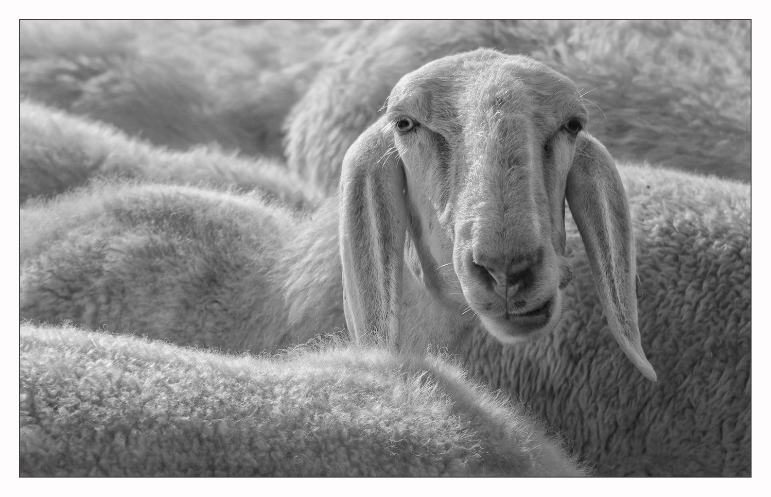 Ottimo ritratto… Molto bella la composizione con il primo piano della pecora che emerge dai dorsi delle compagne