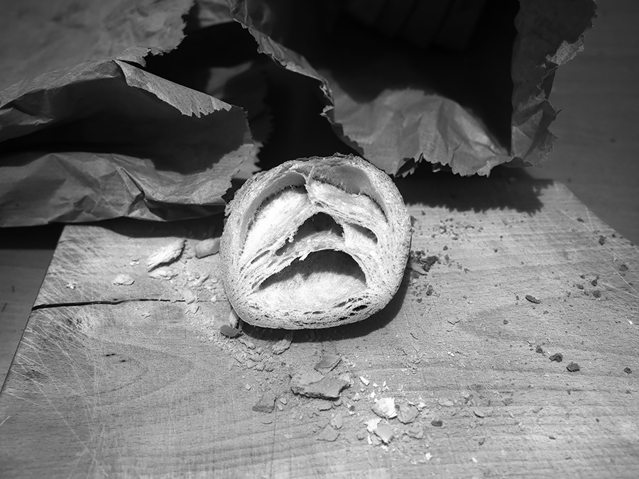 Una maschera da antico teatro greco improvvisamente emerge dal taglio di questo profumato pane.Formidabile immagine che può far sorridere o spingerci a più meste considerazioni.Speriamo che anche questa volta appaia il "Deus ex machina" a risolvere la tragedia che stiamo vivendo!Sempre bravissima a vedere e proporci immagini mai banali. Un caro saluto,Sergio.