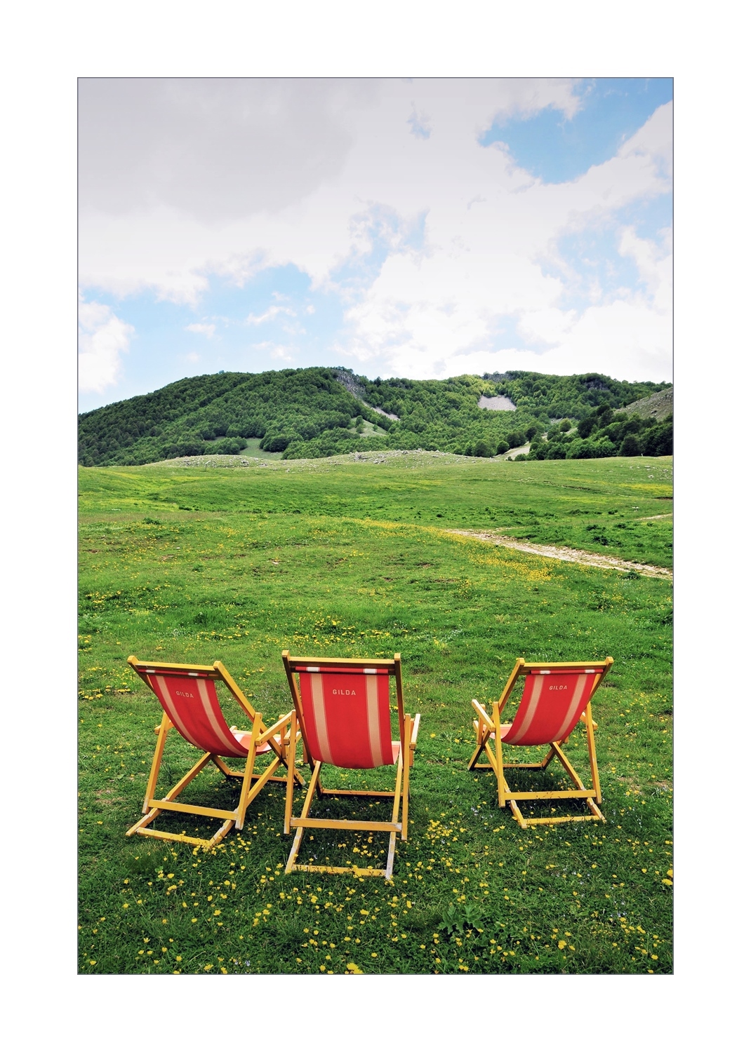 La bicromia rosso-verde mi piace sempre molto… Tu hai proposto un’immagine semplice ma molto ben composta, tutto è al punto giusto, anche i particolari, come il richiamo tra il legno chiaro delle sedie a sdraio e i fiorellini gialli