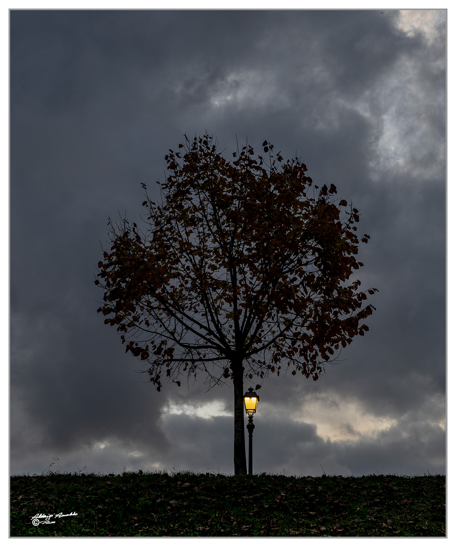 Bellissima Arnaldo… Una composizione perfetta nella sua essenzialità, una sinergia tra albero e lampione in una serata che si preannuncia burrascosa… Mi piace molto.