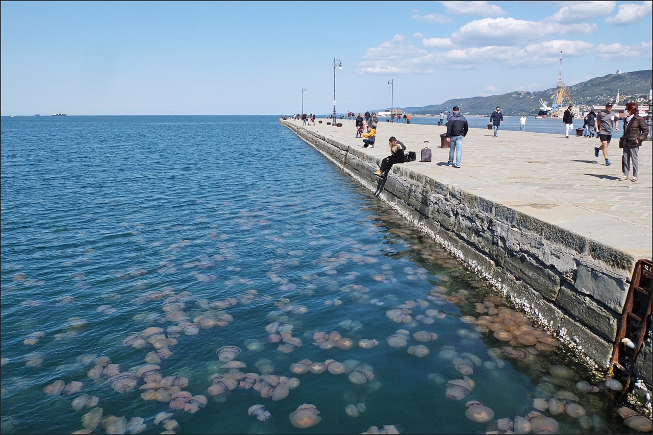 Quante meduse, davvero un’invasione! Mi sarebbe piaciuta anche se avessi dato loro più spazio, riducendo al minimo il molo Ottimo documento.