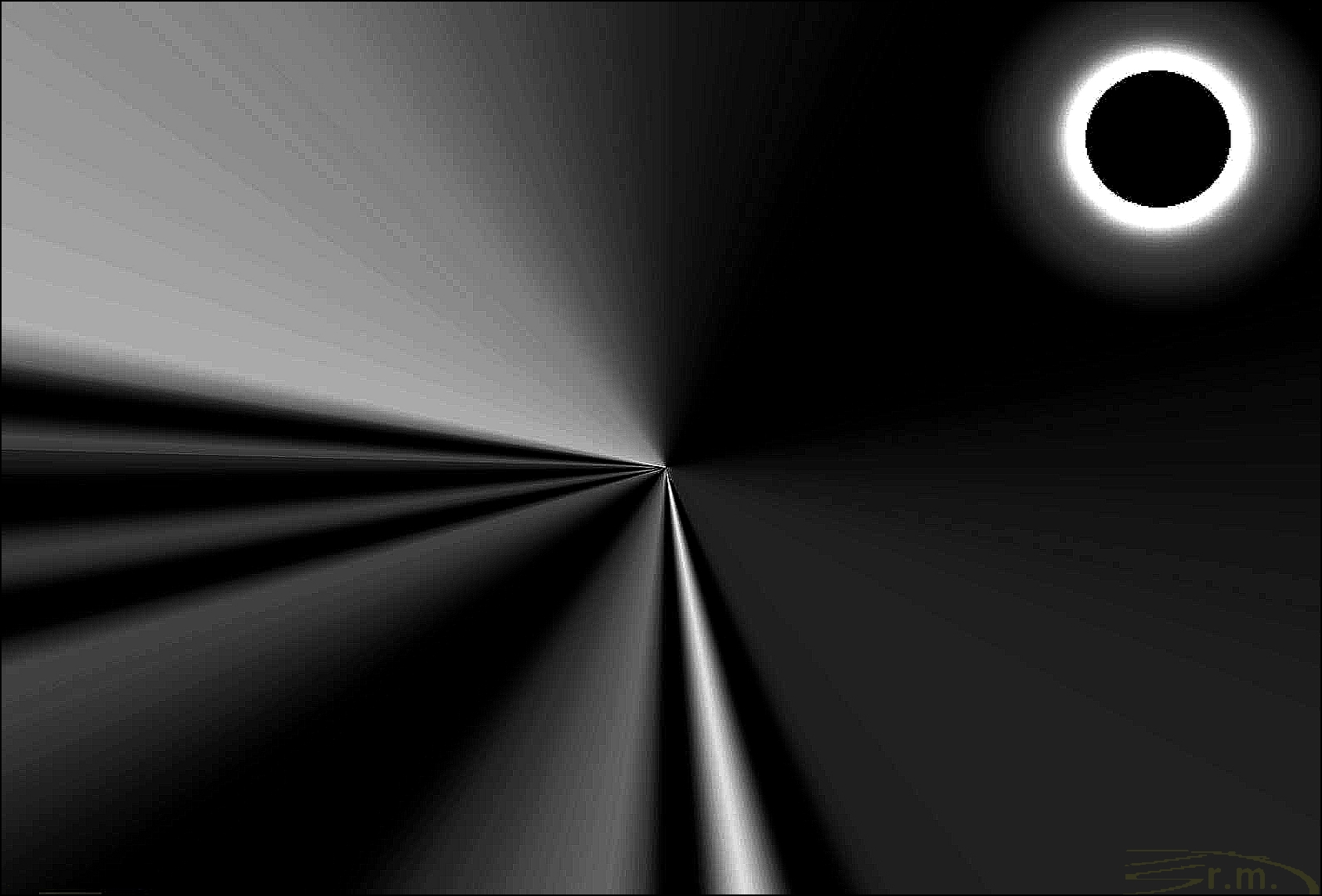 | Un buco nero con l'orizzonte degli eventi ed un punto ( buco bianco ? ) da cui fuoriescono vibrazioni energetiche che condensano. Tra loro una zona indefinita di luce e buio che li avviluppa. Interessante elaborazione, ben eseguita |