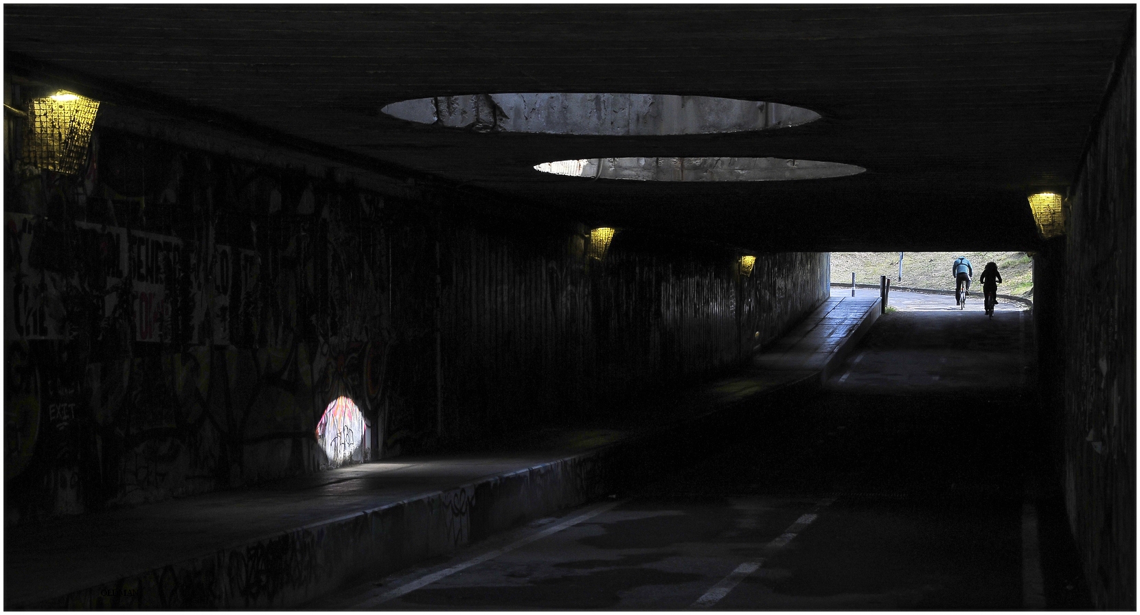 E' si un ottima immagine , con giochi di luce ed ombre, l'occhio poi ci porta in fondo al tunnel dove i due ciclisti sono appena usciti da un percorso tetro.. Ben vista.