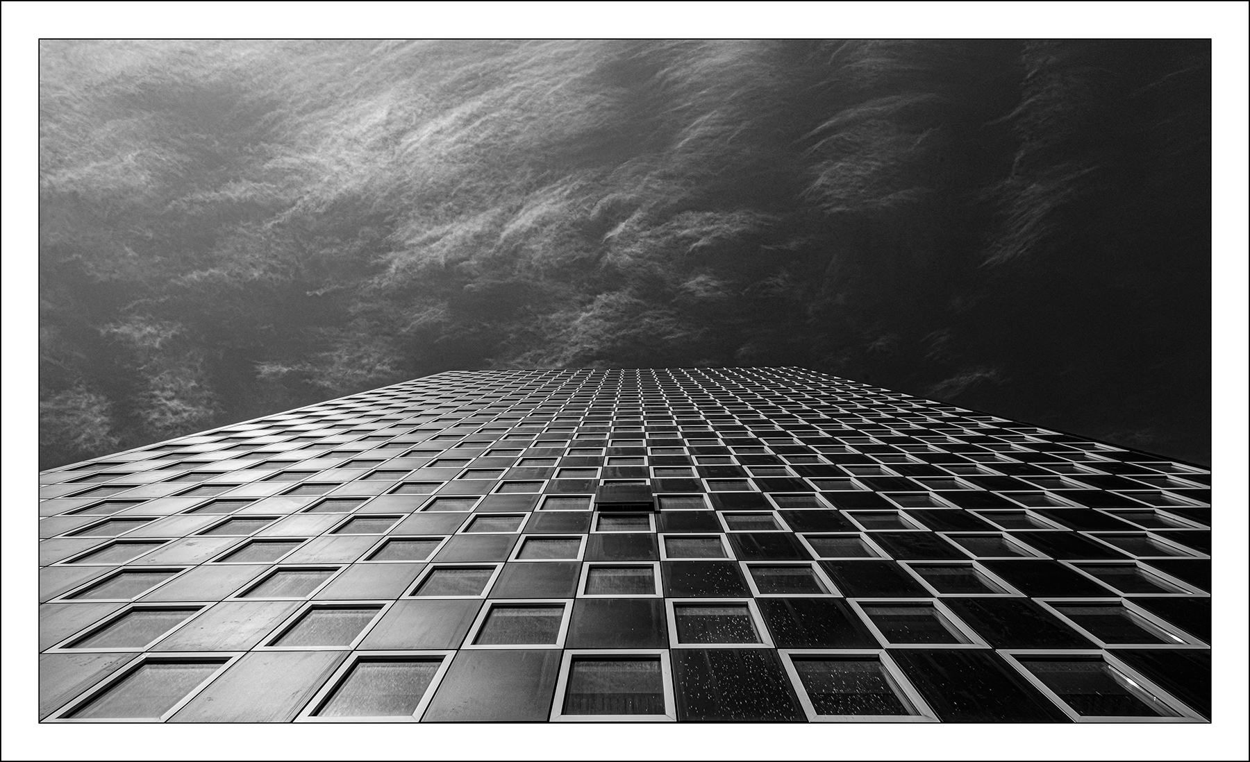 Un cielo strano che fa dubitare per un attimo che sia un cielo. Un fuga ossessiva di finestre che sembrano piastrelle. Un riflesso che scambia lo scuro con il chiaro.