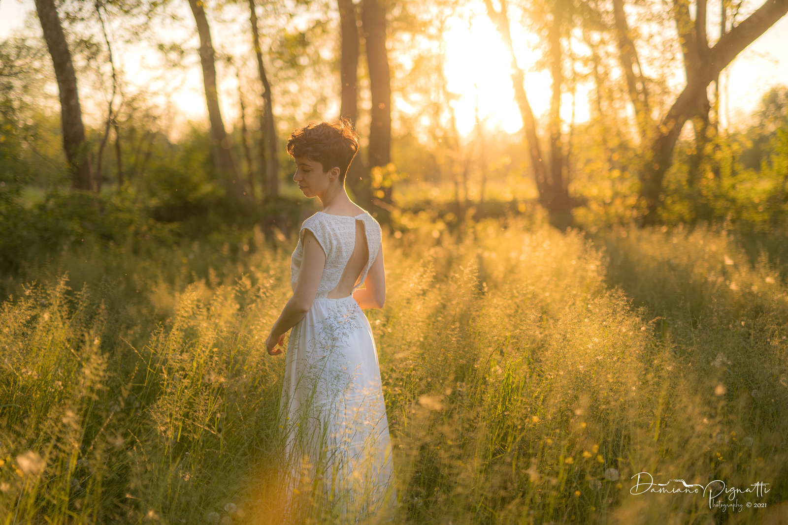 Lei sa perfettamente essere ciò che appare nella foto: assorta, credibilmente assorta mentre si isola da tutto e da tutti immergendosi in un prato avvolto dalla calda luce solare che filtra tra gli alberi all'orizzonte.