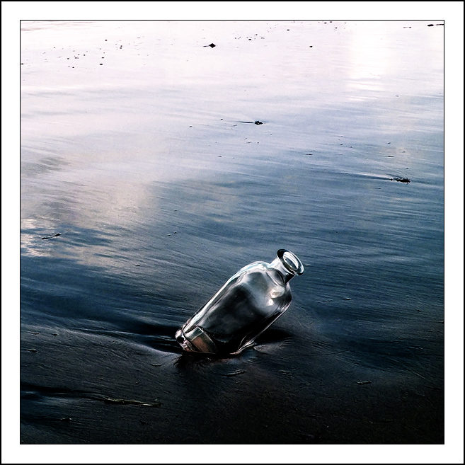 Anch'io trovo interessante la composizione centrale che ferma la bottiglia (oramai il messaggio e' andato), mentre le striscie della risacca danno il movimento che puo' essere il tempo che passa
