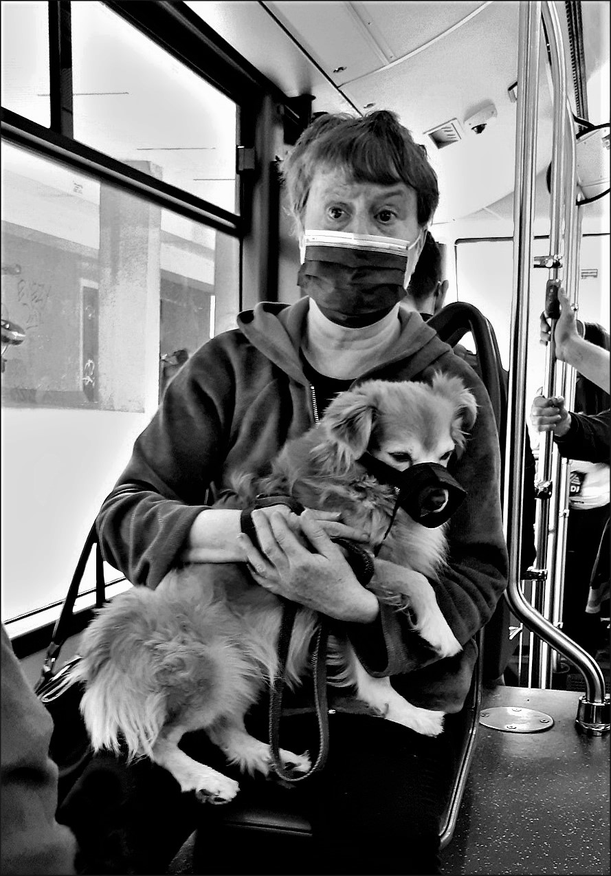 Mascherina e museruola accomunano la donna e il suo cane… ma si può notare anche più di una somiglianza tra loro Ottima immagine, in un bn nitido e deciso. Bravo!