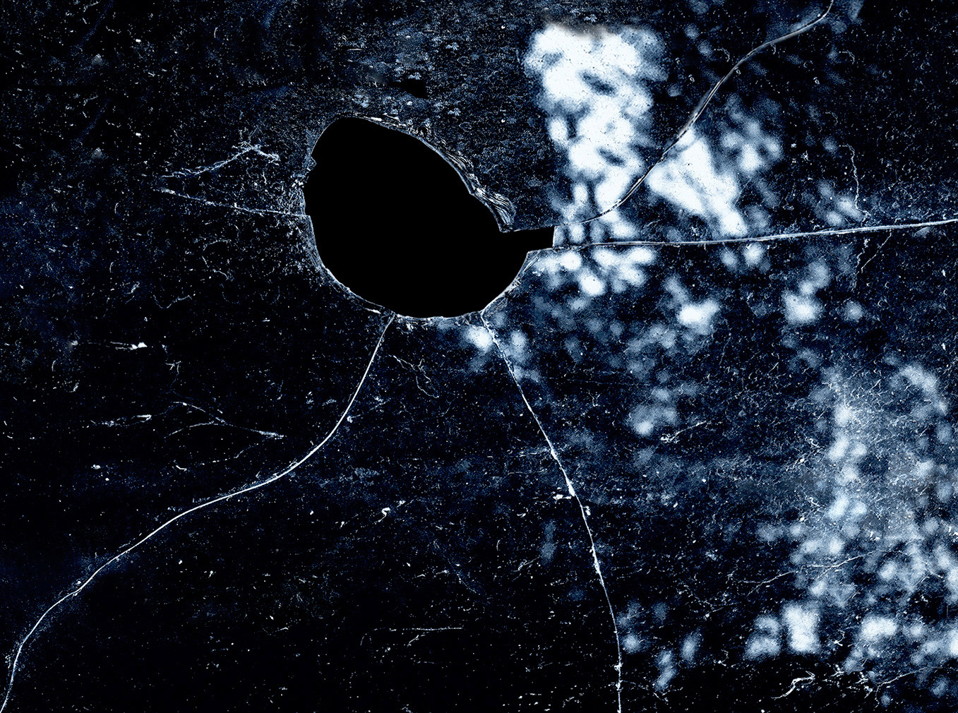 Un foro nel vetro con le sue crepe che vorticano attorno.