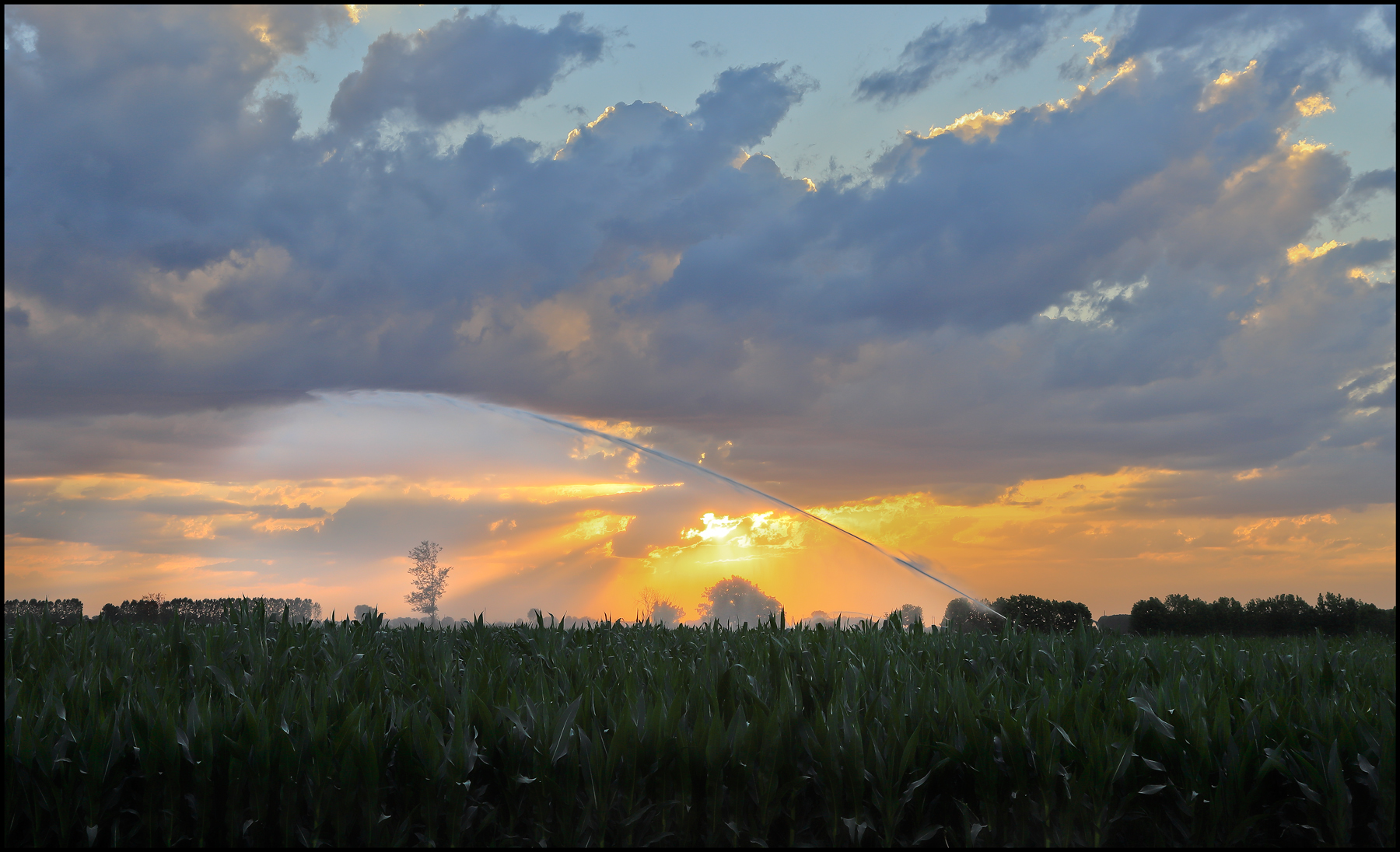 | Mi piacciono i particolari toni morbidi assunti dal granturco ancora giovane in controluce. Bello il ventaglio degli zampilli d'acqua contro la zona arancione di luce del cielo. Un' immagine sicuramente apprezzabile. Ciao, Tiziano |
