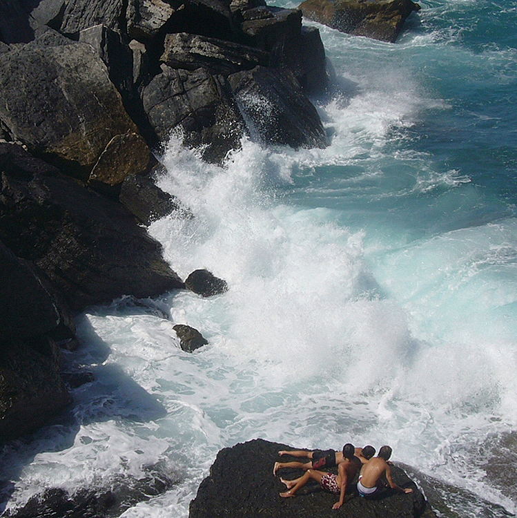 Sembra quasi che un'onda anomala possa raggiungerli e inghiottirli fra i massi sottostanti con certo grado di rischio per l'incolumità. bello il colore dell'acqua che regala una bella sensazione di freschezza e benessere e di forza della matura. Un valido scatto. Ciao, Tiziano