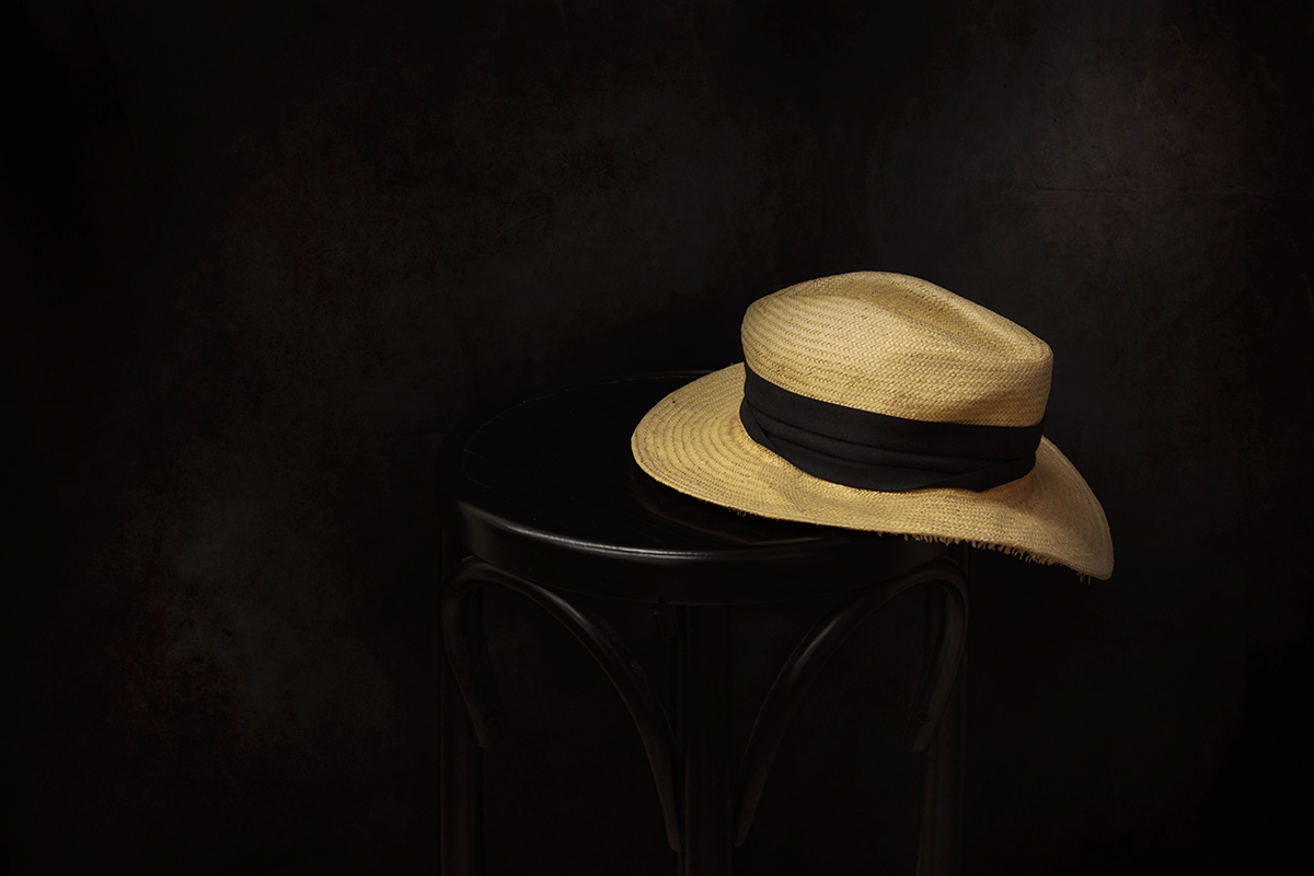Un cappello “luminoso”, poggiato su una tavolo appena percettibile, avviluppato dal buio......immagine dal forte impatto emotivo, in armonia con il titolo. Notevole