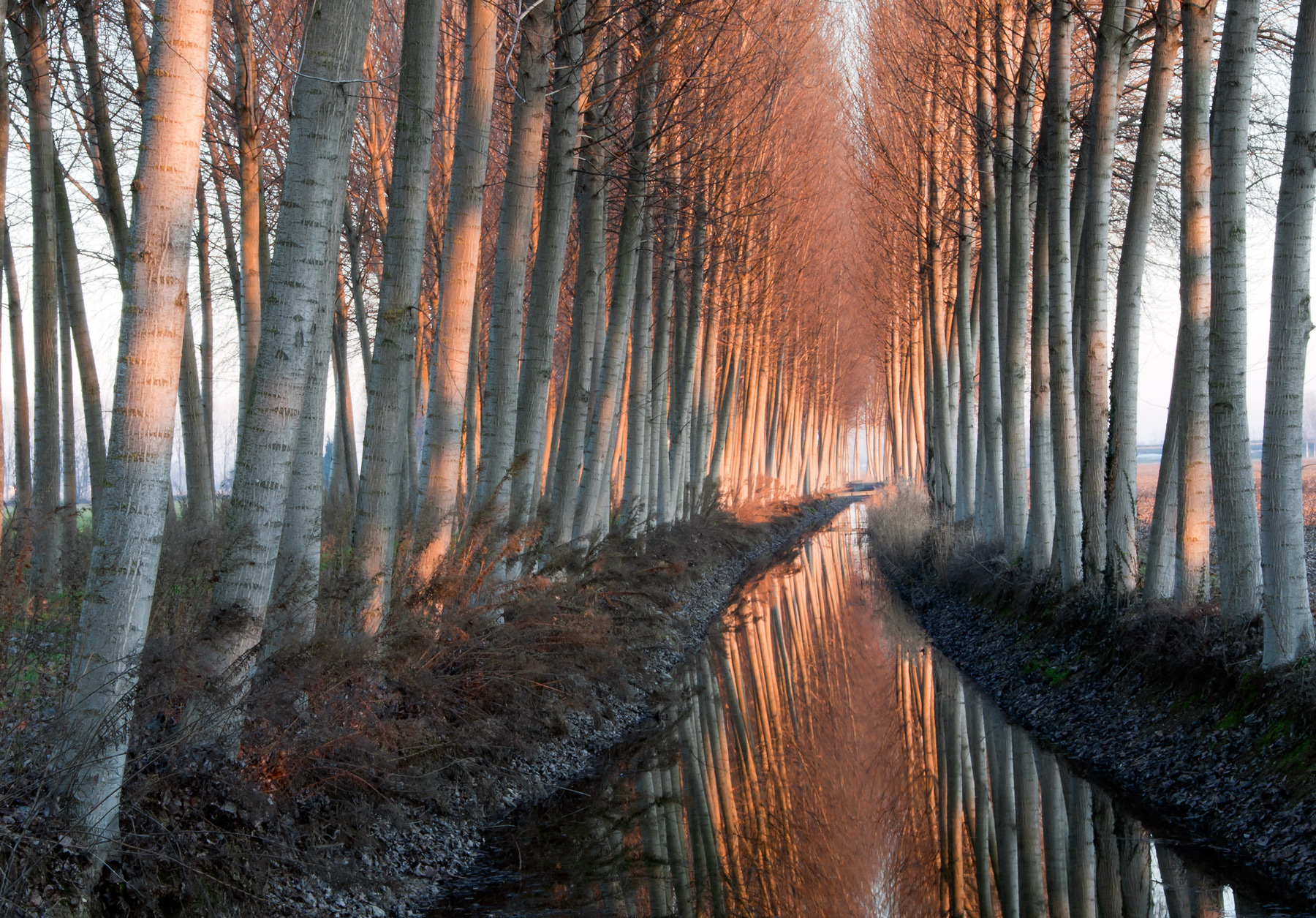 Che meraviglia questi alberi color rame! Perfetta la bicromia con il grigio di quelli in ombra… Fantastica immagine, complimenti!