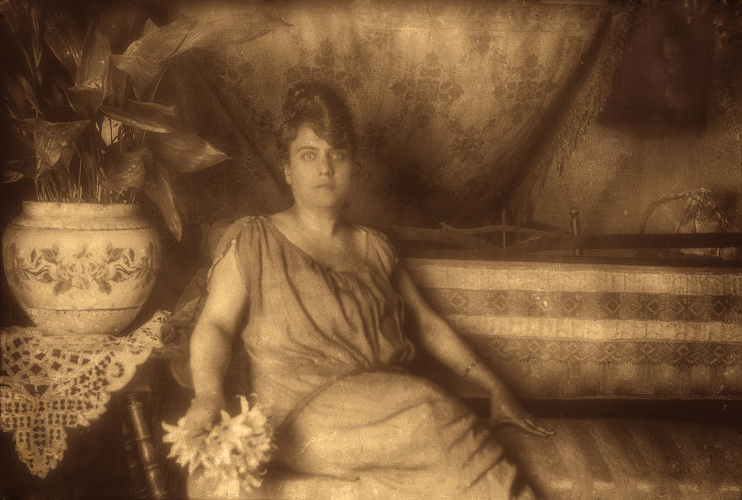 | Direi anni ‘10-‘20 se non prima. Ai tempi il ritratto fotografico risentiva pesantemente dell’influenza della pittura di scuola, i ritratti per lo più fatti in studio con fondali e tendaggi e le composizioni molto formali. La lastra di vetro é piuttosto rovinata ma l’immagine é ancora nel complesso integra ed interessante per abbigliamento, acconciatura e oggetti di contorno.