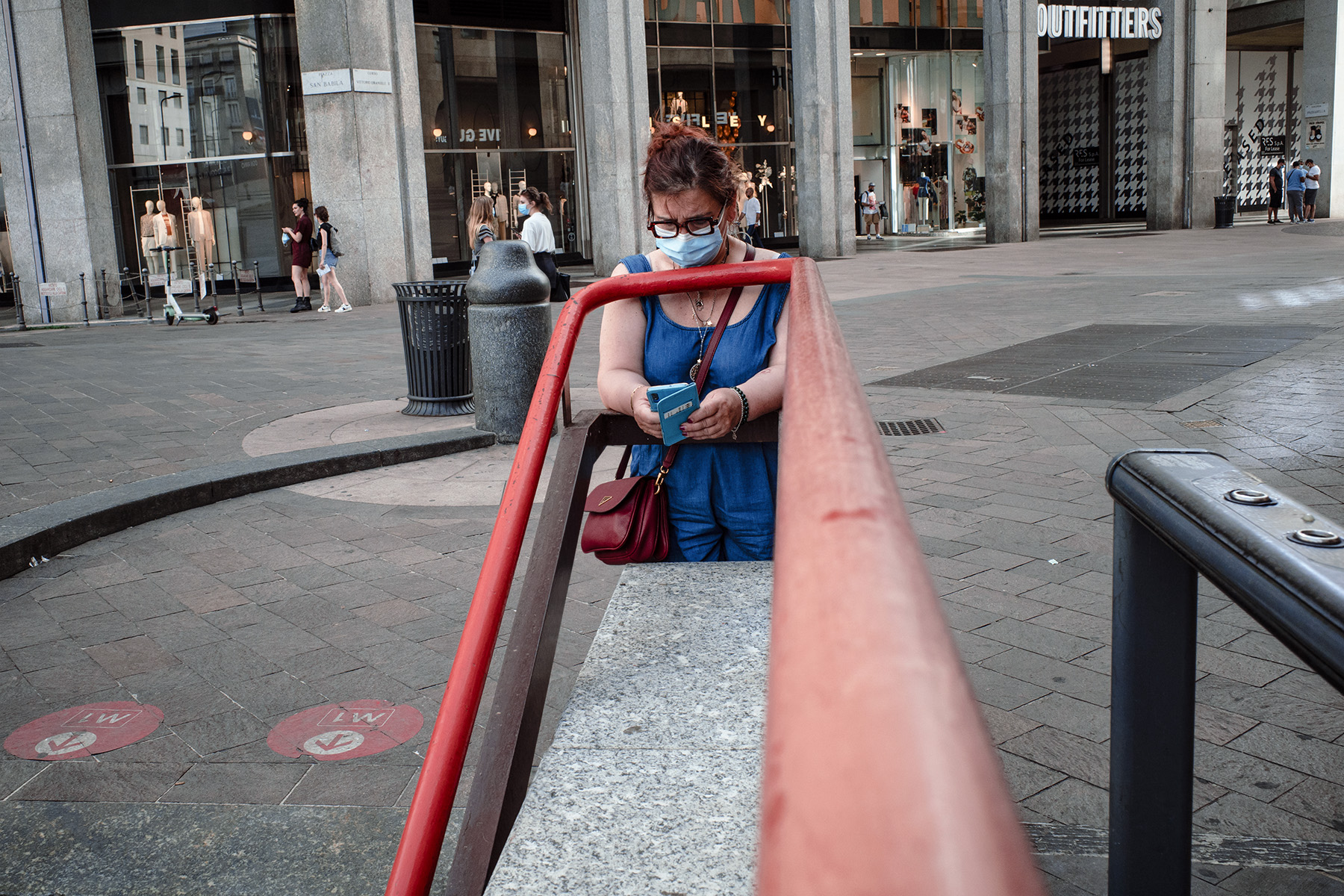 | la linea rossa ci porta immediatamente al soggetto impegnato a guardare il telefono in una piazza San Babila quasi deserta, ottimo scatto.