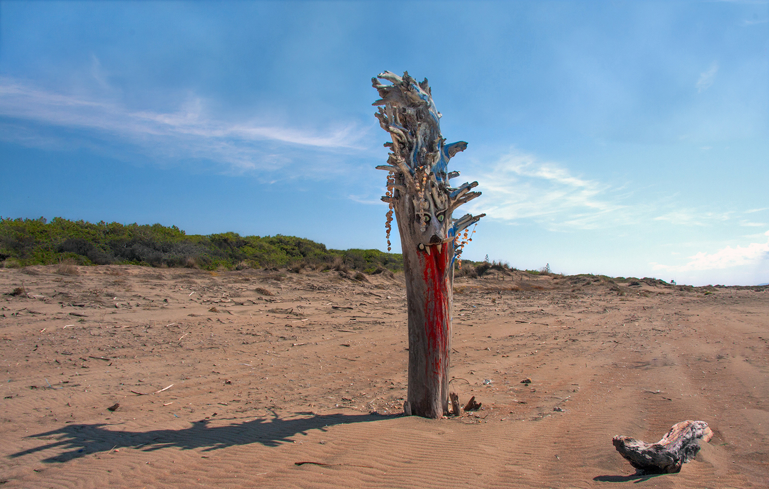 Davvero inconsueto questo totem marino… e anche un po’ inquietante, il sangue e le collanine appese la fanno sembrare una rappresentazione sacrificale… ma mare e sole la riconducono a giochi di bambini… Immagine interessante.