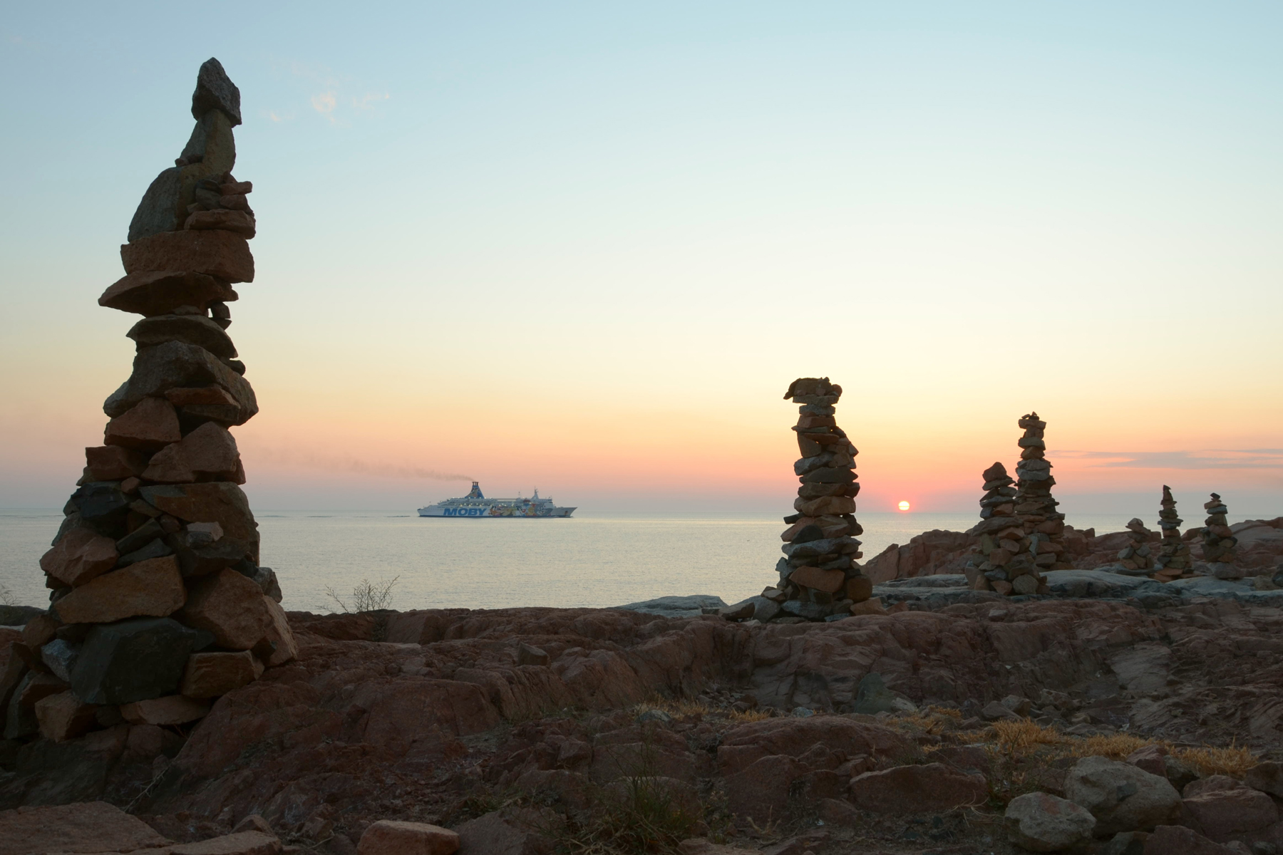 Tanti omini di pietra osservano la Moby passare sotto costa in una tenue luce del tramonto.