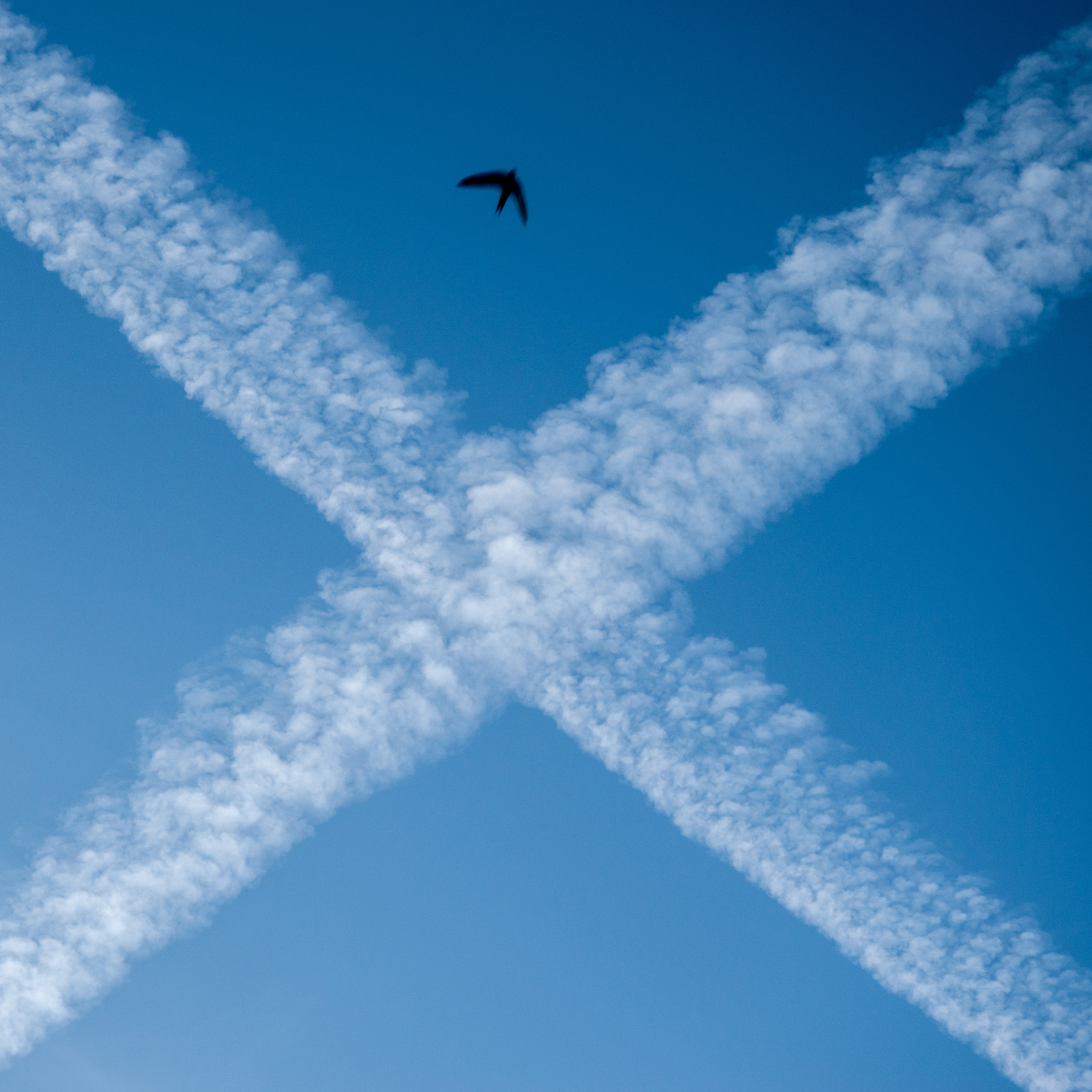 | Le scie di condensa hanno formato una X, come un voler eliminare, con il loro inquinamento, lo spazio vitale del volatile. Un bella ed eloquente immagine |