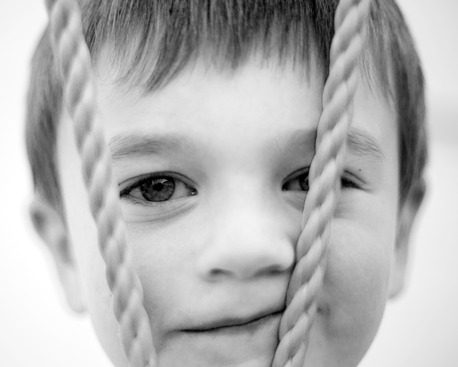 PDC ridotta al minimo,la foto e' tutta nell'occhio del pargolo ; buona la scelta compositiva ,con le corde a far da frame alla parte "interessante" del fotogramma. BN morbido e tendente all'alto, in sintonia con la delicatezza trasmessa da questo viso. Bella immagine,mi piace molto .