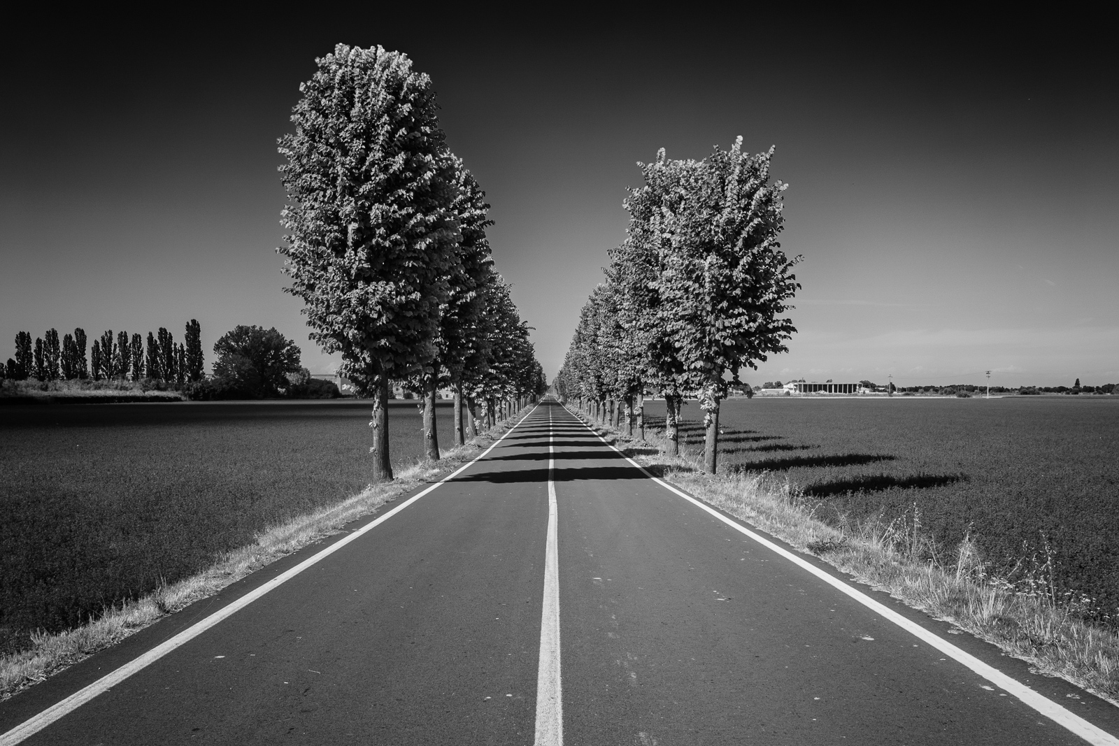 | Bitume,due file di alberi ,campi coltivati,cielo |