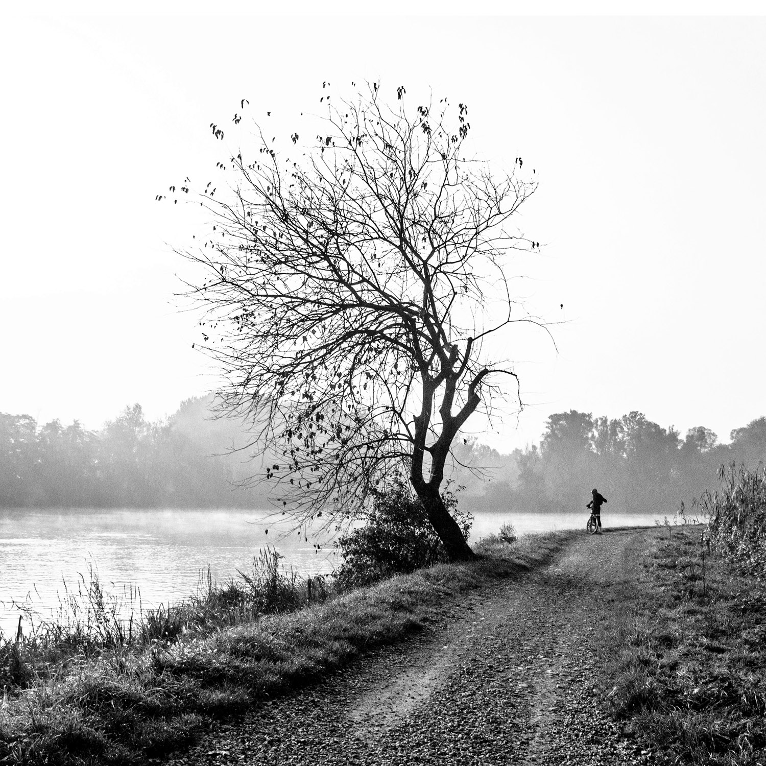 Le forme assunte dalla ramificazione di quell'albero sono una poesia, l'armonia che emanano rasserena l'anima e innesta una gemma di fiducia in questo storico destino avverso, in questa vita condizionata che stiamo vivendo. Il ritorno e il ricorso alla natura ritengo che sia salvifico. Dio è lì. La verità è li, in ciò che tace, nel silenzio, in chi non sbandiera la sua immensa bellezza ma la porge come come una carezza di carità. Il cicilista sembra come voltarsi all'indietro o come volgere lo sguardo sulle luci fumanti del risveglio della natura delle acque del lago che lambisce albero e stradina. Un incanto.