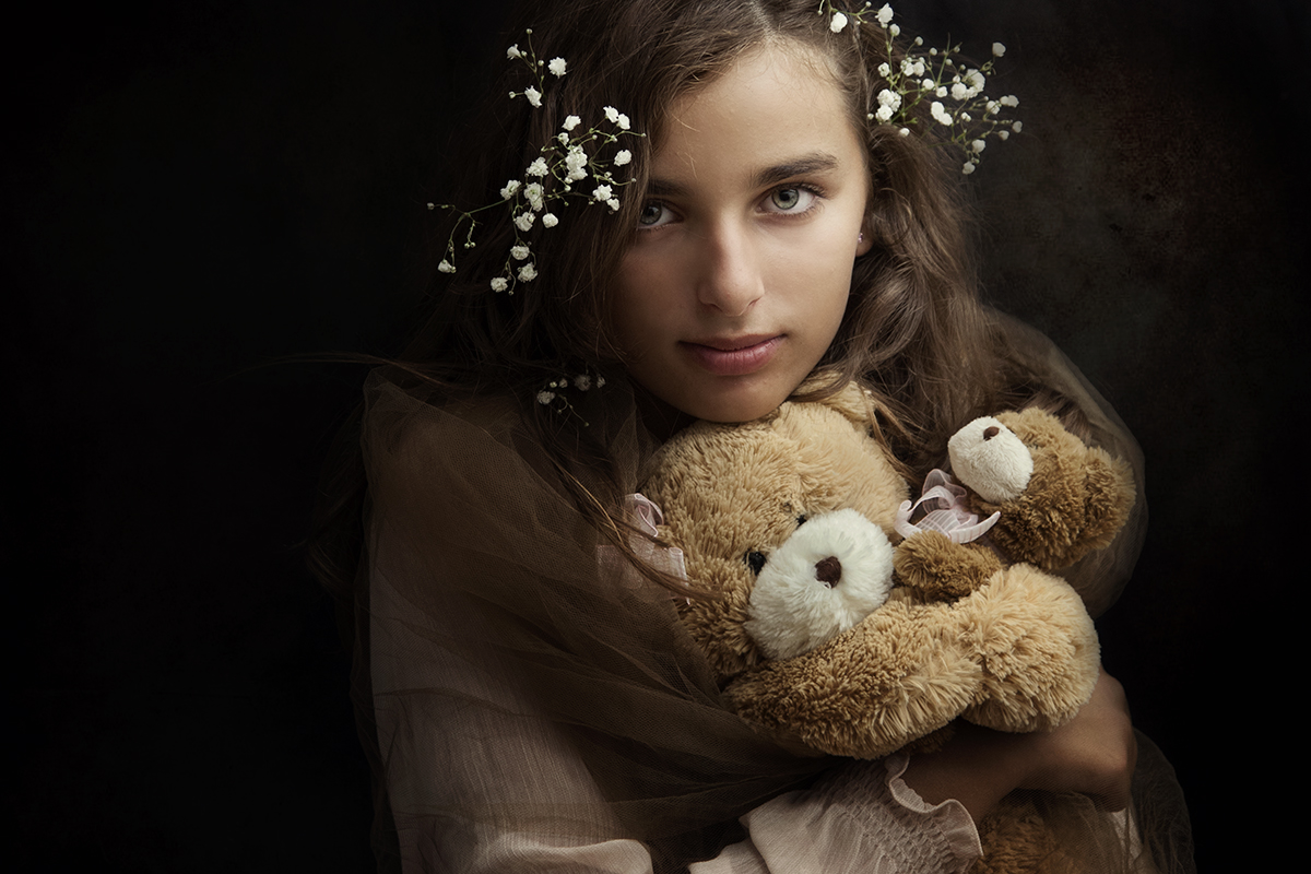 Difficile imprimere tanta delicatezza in un ritratto così di classe e sofisticato. Un po' come lei, la dolcezza di una bimba e l'eleganza di una donna. È bella, è intensa, ma la sua fragilità è sussurrata da quell' abbraccio così forte al suo peluche, amico sicuro e protettivo. I toni sono stupendi. Complimenti.  _________________