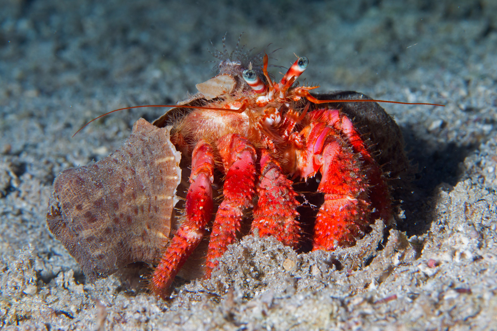 Un paguro (Dardanus calidus) a passeggio su un fondale sabbioso;