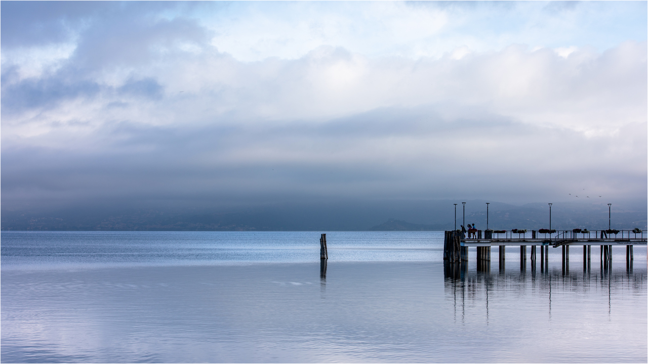 Il pontile si inserisce bene nella scena e quelle nuvole leggiadre e appena accennate in alto a sinistra sono un morbido apostrofo.