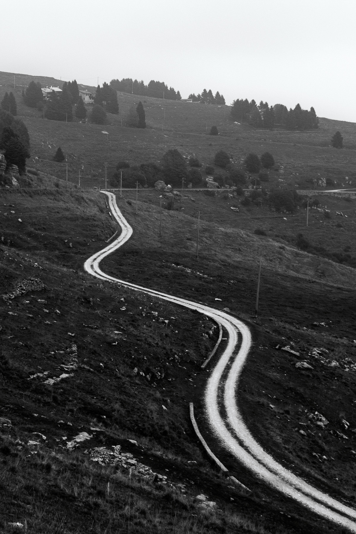 Usando quasi un gioco di parole mi viene da dire....Il bianco della strada si fa strada nell'economia visiva dell'immagine così come concepita in questi toni di bianco e nero un po' cupi anche per la probabile condizione atmosferica un po' greve. Mi pare che il punto di ripresa sia buono e anche l'idea della composizione con il fulcro visivo della sinuosità della stradina di sterrato. Mi piace. Tiziano Ok!