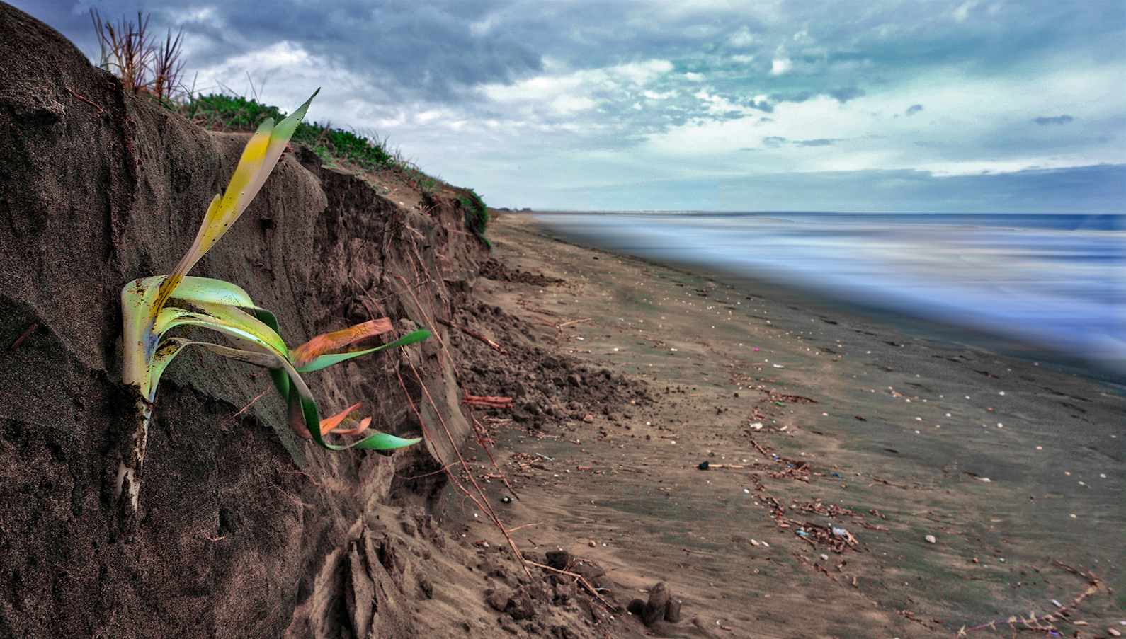 La mareggiata lascia i detriti sulla spiaggia ma fa anche franare il terreno costiero, in cui una pianta rimane tenacemente abbarbicata… Immagine molto interessante, quasi una metafora Smile