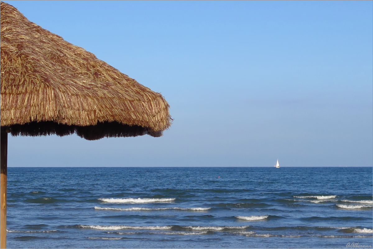Una composizione curata nel dettaglio,regola dei terzi,chiusure,completa una scena essenziale e pulita. Pochissimi elementi a cui affidare il racconto, il bianco della schiuma riprende piacevolmente la vela. L'ombrellone forse è una quinta un po' ingombrante,ma ha la sua funzionalità. Ciao