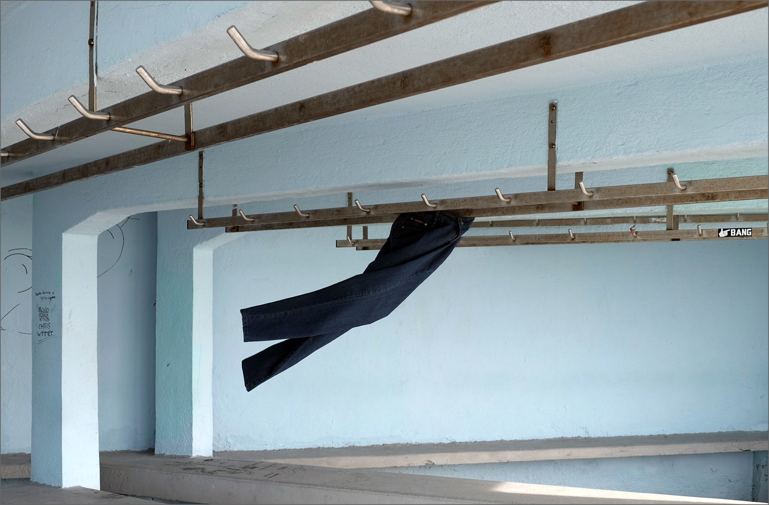 Dei Jeans che sembrano nuovissimi casualmente agganciati alle griglie del soffitti sventola e ci immedisima nel frangente, ci fa apparire e tangere quel vento che altrimenti resterebbe invisibile. La fotografia non può trasmettere e racchiudere una sensazione fisica e percettiva come il vento ma si avvale di uno stratagemma come questo per farla pervenire nel retaggio mentale dell'osservatore e quando lo fa in una situazione così anonima e particolare, inusuale, si trasforma in una foto davvero interessante.