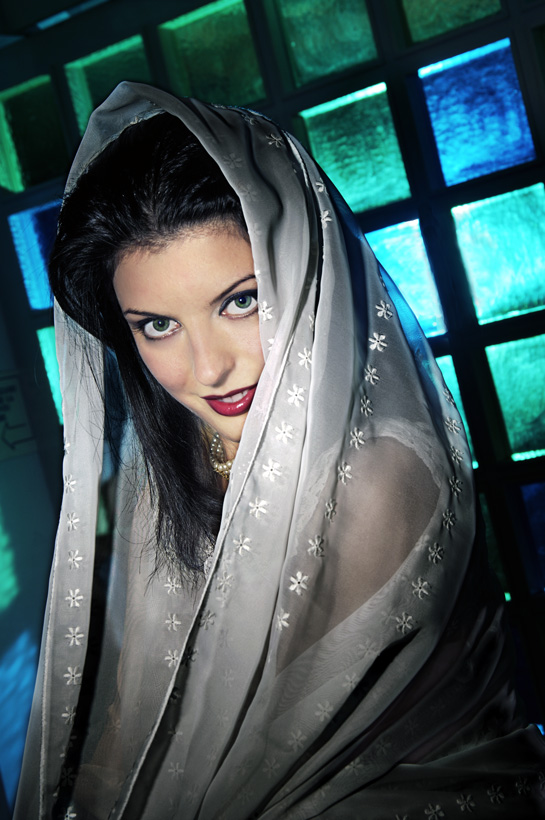 Con la post produzione ho ammorbidito non poco alcune ombre molto dure presenti sul viso della modella (sotto il naso in particolare) e scurito il velo in modo da concentrare l'attenzione proprio sul volto.