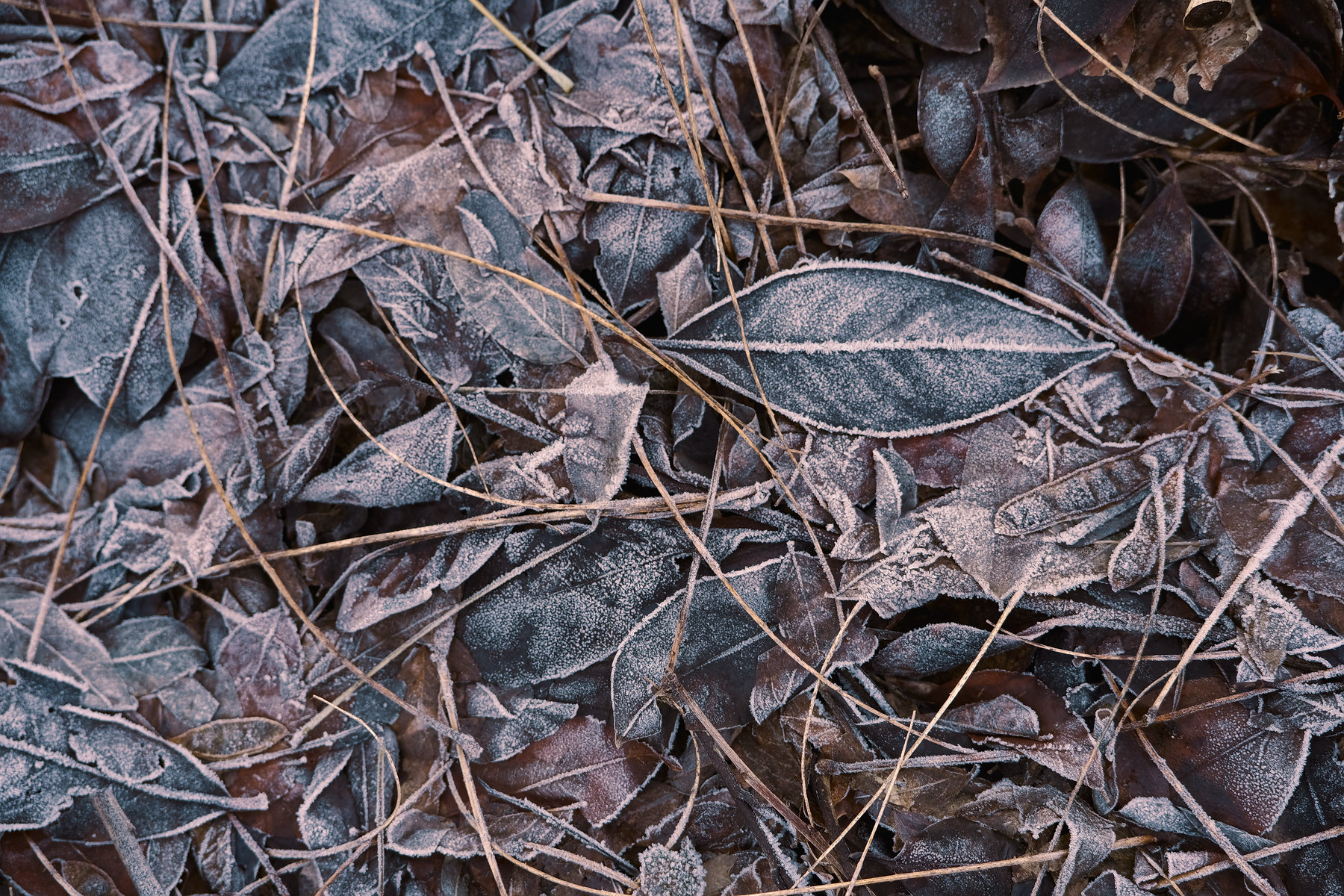 La brina sulle foglie le veste d'argento e ricorda i sali dello sviluppo della carta da stampa in camera oscura quando si sedimentano in una bacinella lasciata aperta per giorni ad ossidare.