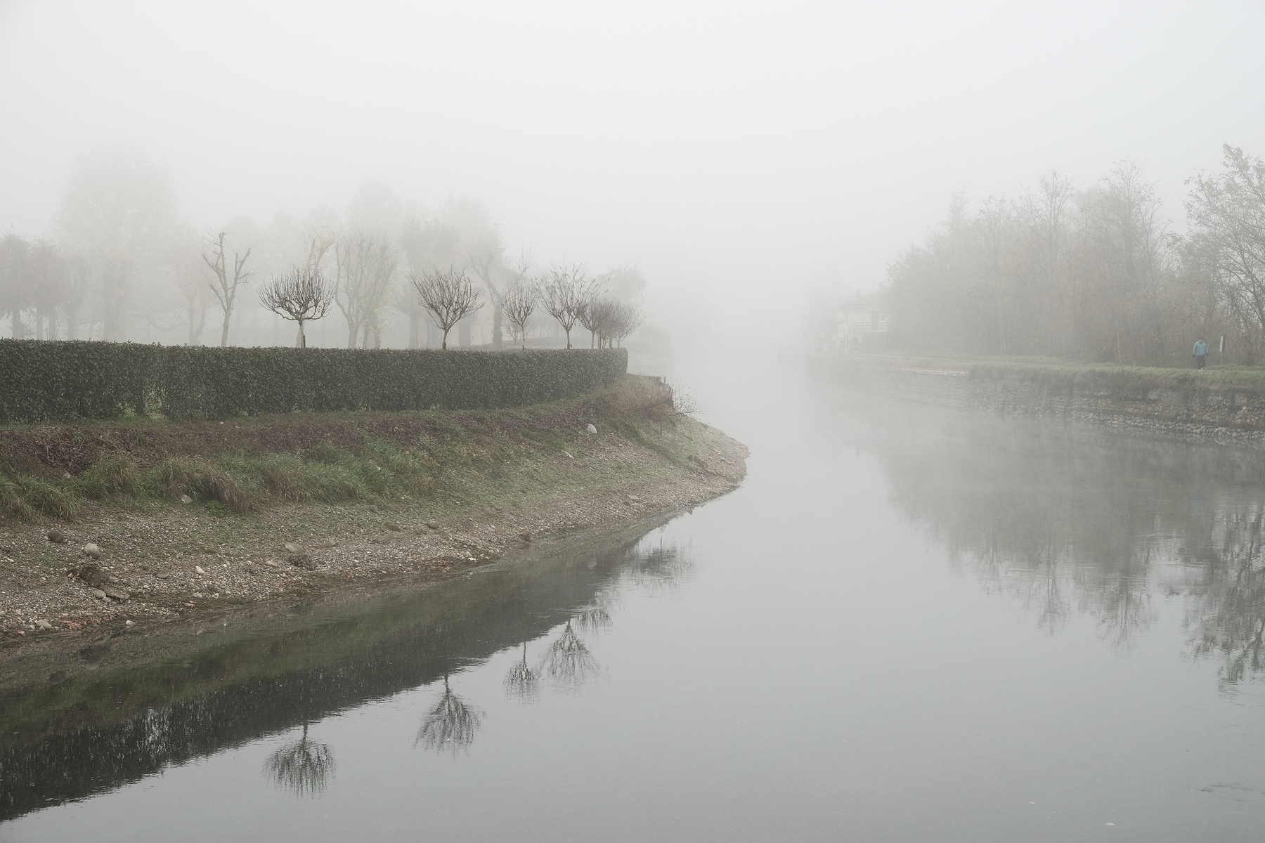 Una semicurva sul canale che sfuma lentamente nella foschia. L'atmosfera è tranquilla, silenziosa, sospesa, bello scatto composto con cura e competenza